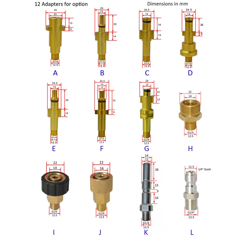 Выберите подходящий адаптер для мойки под давлением. Пожалуйста, проверьте размер адаптера и убедитесь, что он подходит для вашей машины. Мы не несем никакой ответственности за несовместимость адаптера. Если вы не уверены, пожалуйста, свяжитесь с нами и отправьте нам фотографию вашего пистолета и копья, мы поможем выбрать подходящий адаптер.