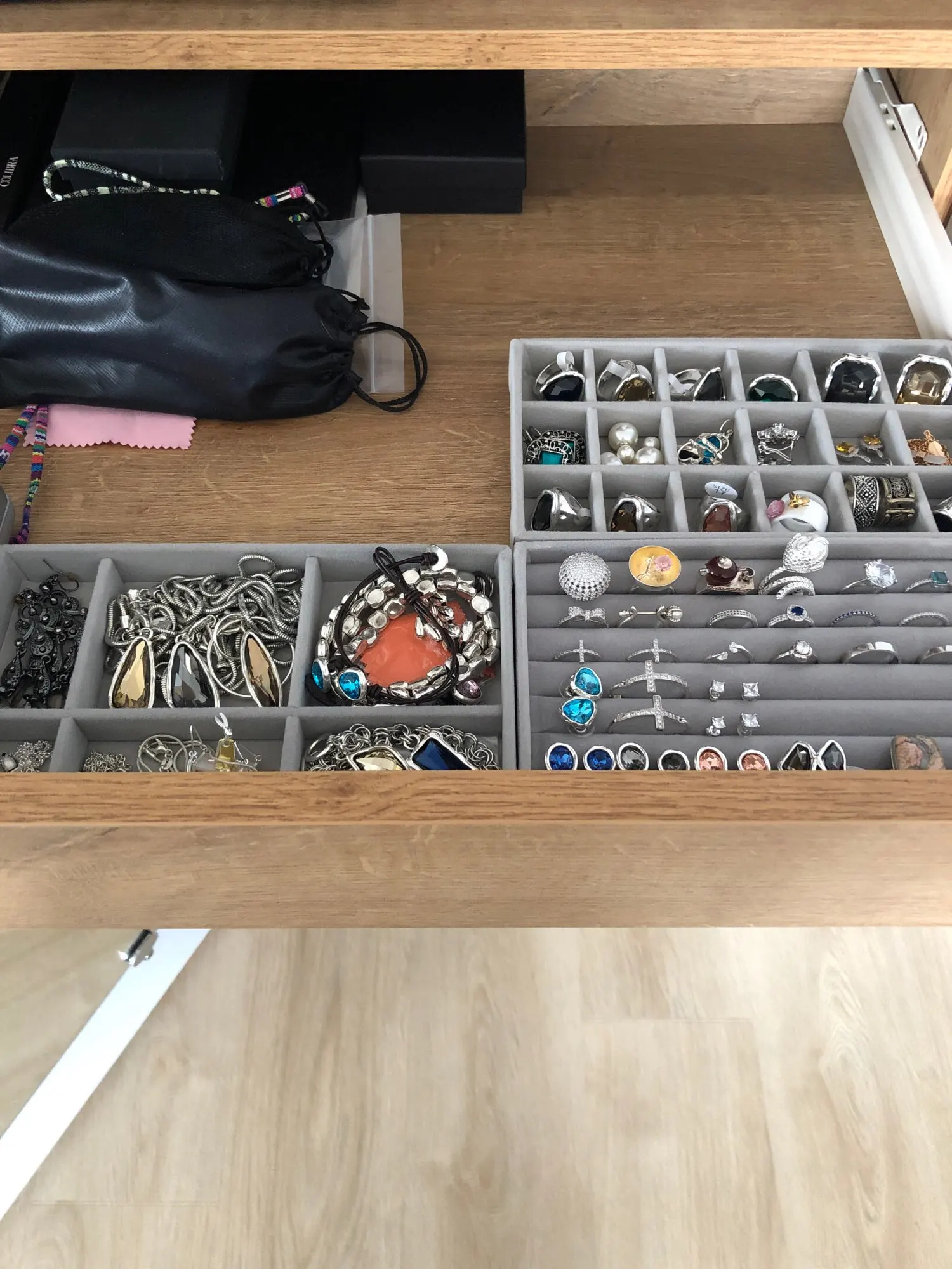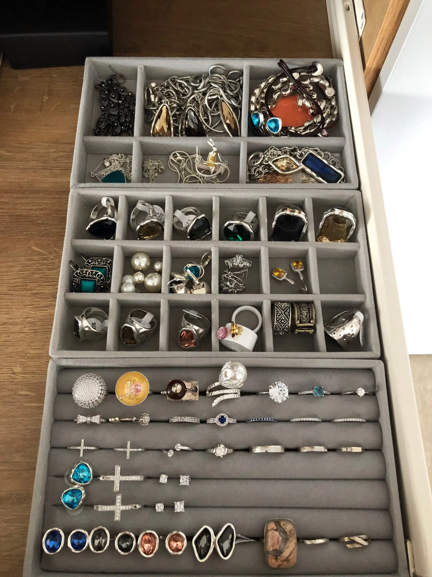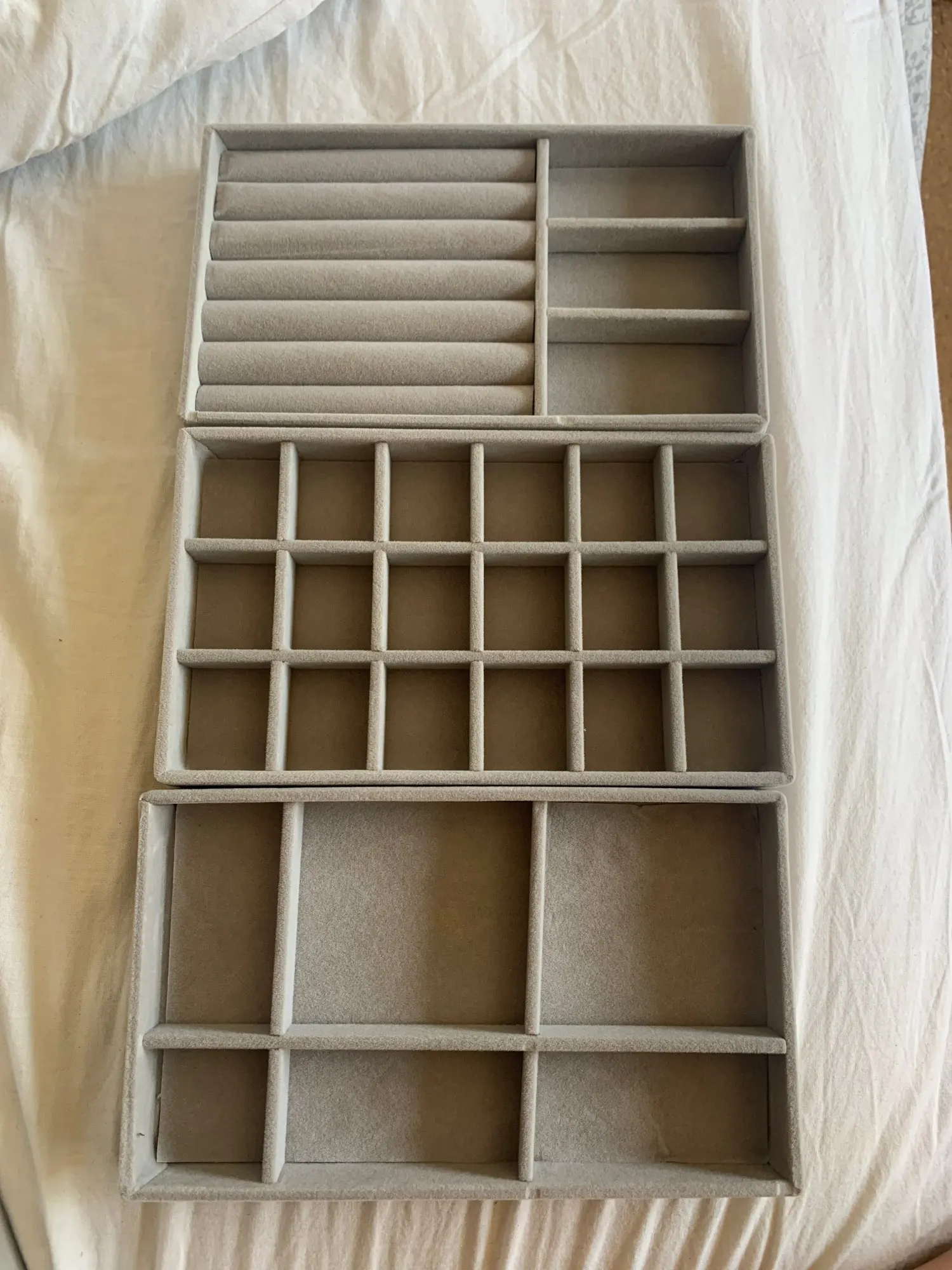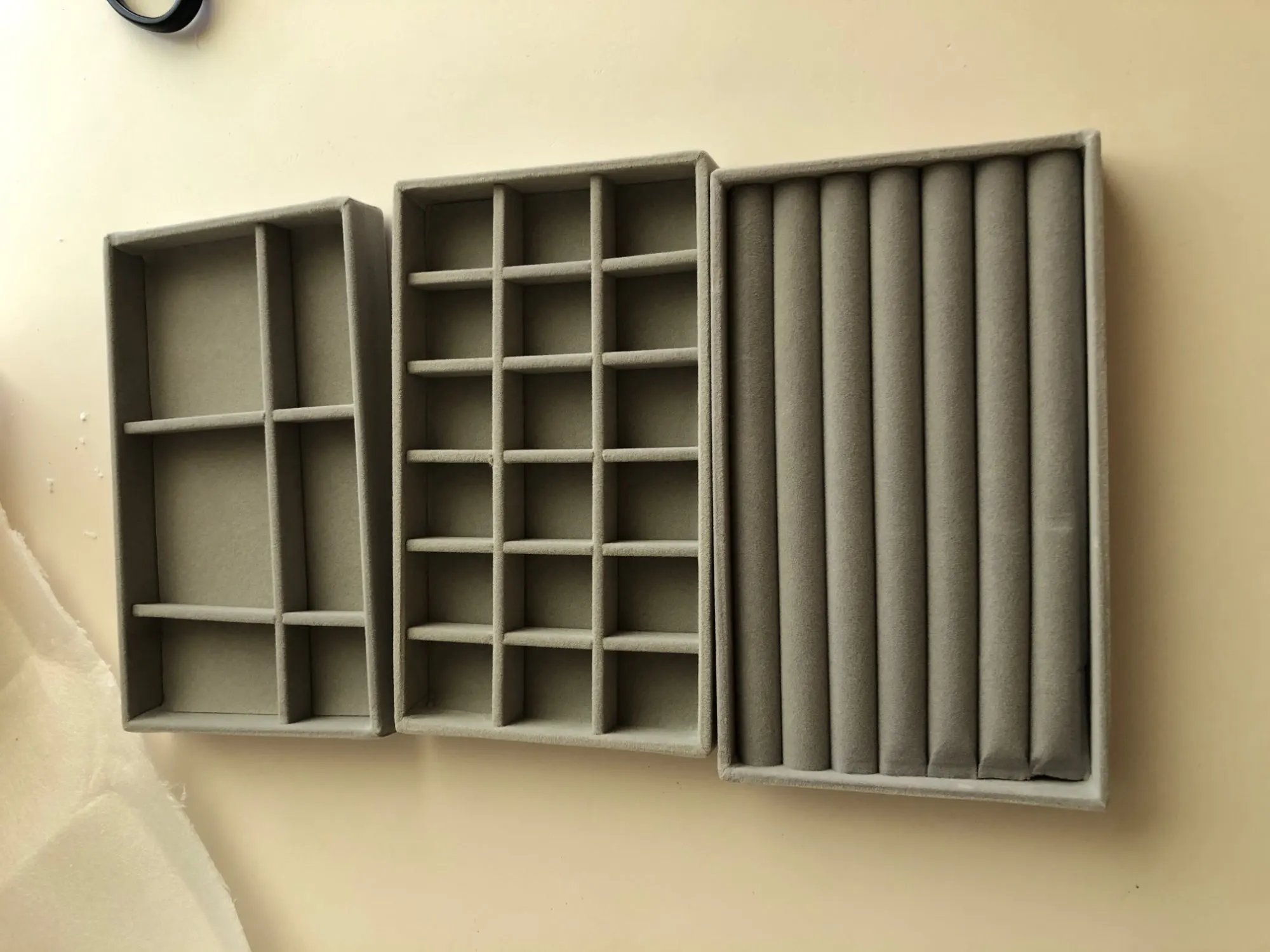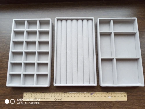 упаковка очень слабая, скорей всего уголок подставки из за этого повредился, внутри плохо держатся эти перегородки, считаю цена завышена за такое среднее качество, материал бархат, маленькие по размеру, в целом удобные, но качество страдает, запаха вроде нет, до этого брала полноценную шкатулку, но к сожелению в ней серебро начинает окисляться, на одежде пятна остаются, посмотрим как эти шкатулки себя поведут