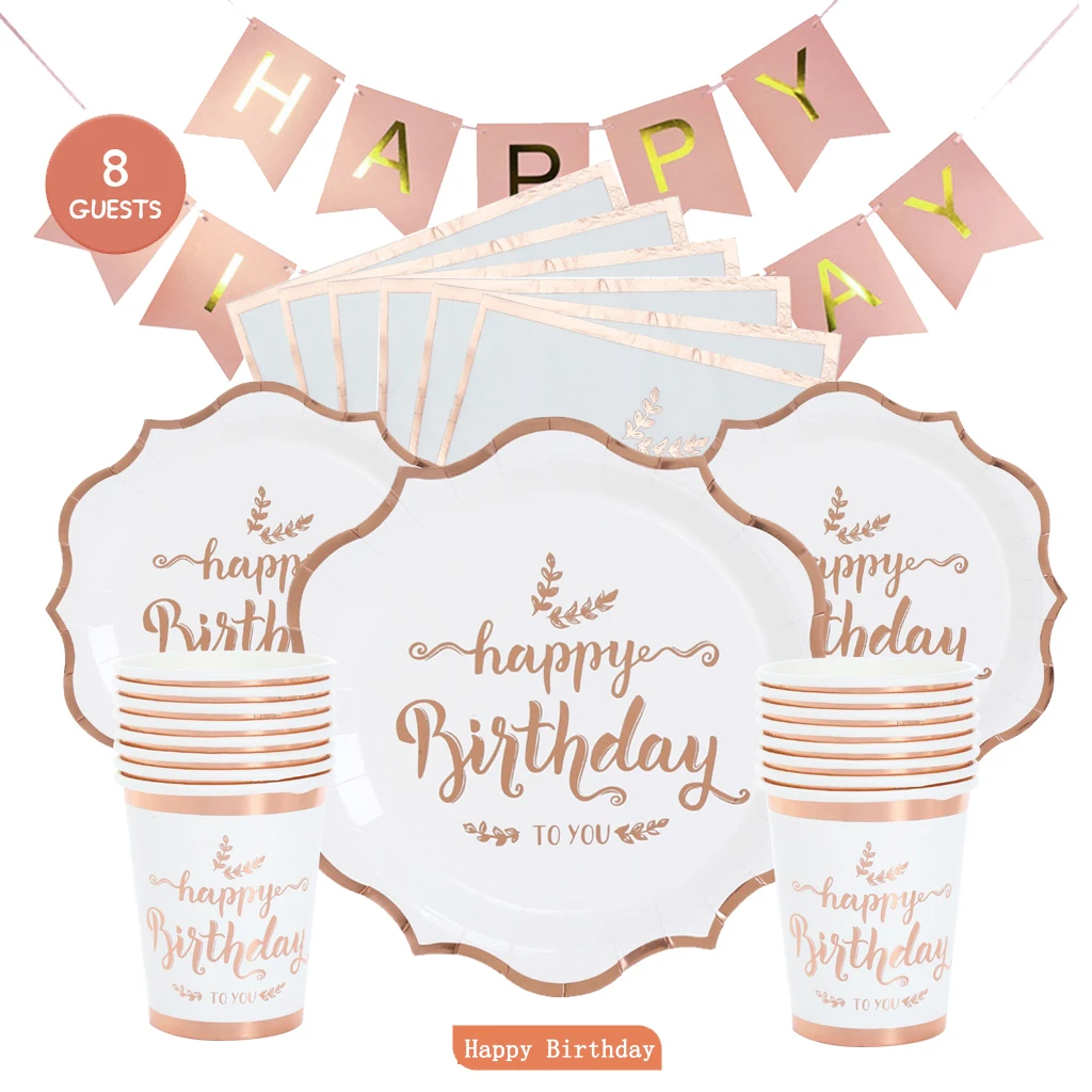 Розовое золото с днем рождения одноразовая посуда розовый пластины салфетки для стаканчиков Для женщин 16 18 21th Happy День рождения Декор для девочек в розовом цвете, 1st