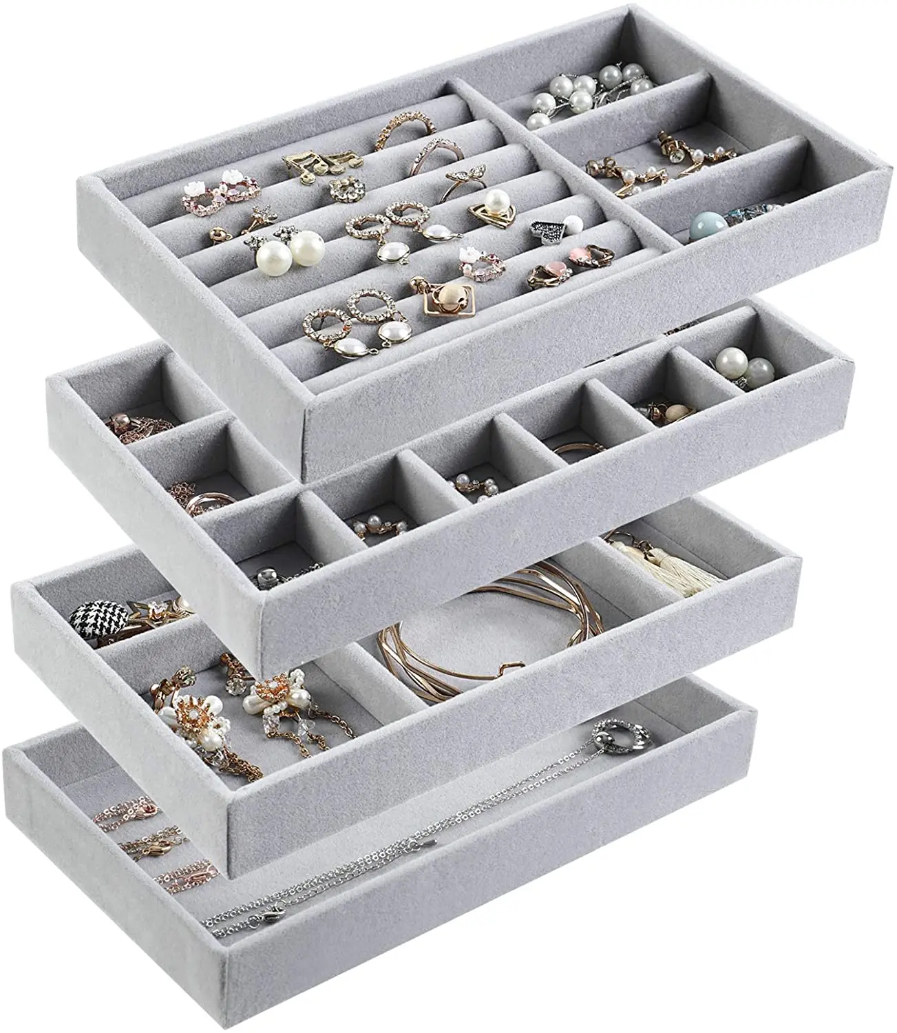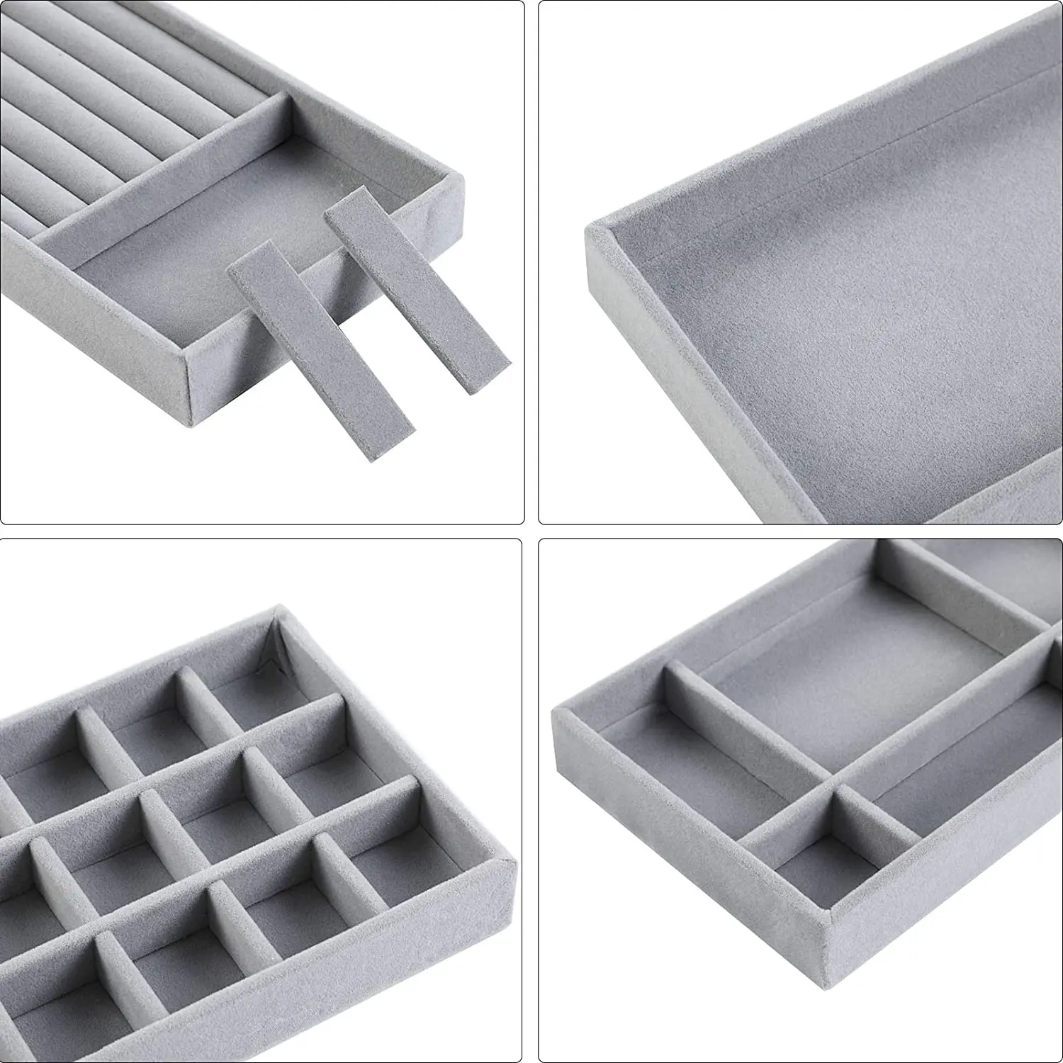 Штабелируемый ящик для хранения ювелирных изделийНабор из 4 Штабелируемых бархатных ювелирных лотков, изготовленных из качественных материалов, поможет вам хранить и отображать ваши ювелирные изделия и защитить ваши ювелирные изделия от любых повреждений.Пространство для хранения DIYУникальный дизайн позволяет регулировать размер лотка для ювелирных изделий и Количество отсеков, чтобы удовлетворить ваши личные потребности в хранении.Особенности продукта:Защищает ювелирные изделия от пыли, запутывания, повреждения, окисления, продлевает срок службы ювелирных изделий.Больше места для хранения, функциональная сегментация.Его можно использовать в качестве декоративной мебели, чтобы добавить больше цветов в вашу комнату.Быстро и эффективно находите подходящие предметы, экономя время.Идеальный подарок для нееИдеальный подарок для девушки, жены, матери, дочери, друга и т. д. Это также подарок на день Святого Валентина, День рождения, День матери, Рождество, свадьбу, помолвку, годовщину и т. д.Посылка включает в себя:1 18-сетка лоток (за исключением ювелирные изделия)1 кольцевой демонстрационный лоток (без украшений)1 ожерелье браслет лоток (за исключением ювелирных изделий)1 лоток (за исключением ювелирных изделий)Размеры товара (Д x Ш x В): 8,4x4,8x1,0 дюйм (ов) на лоток