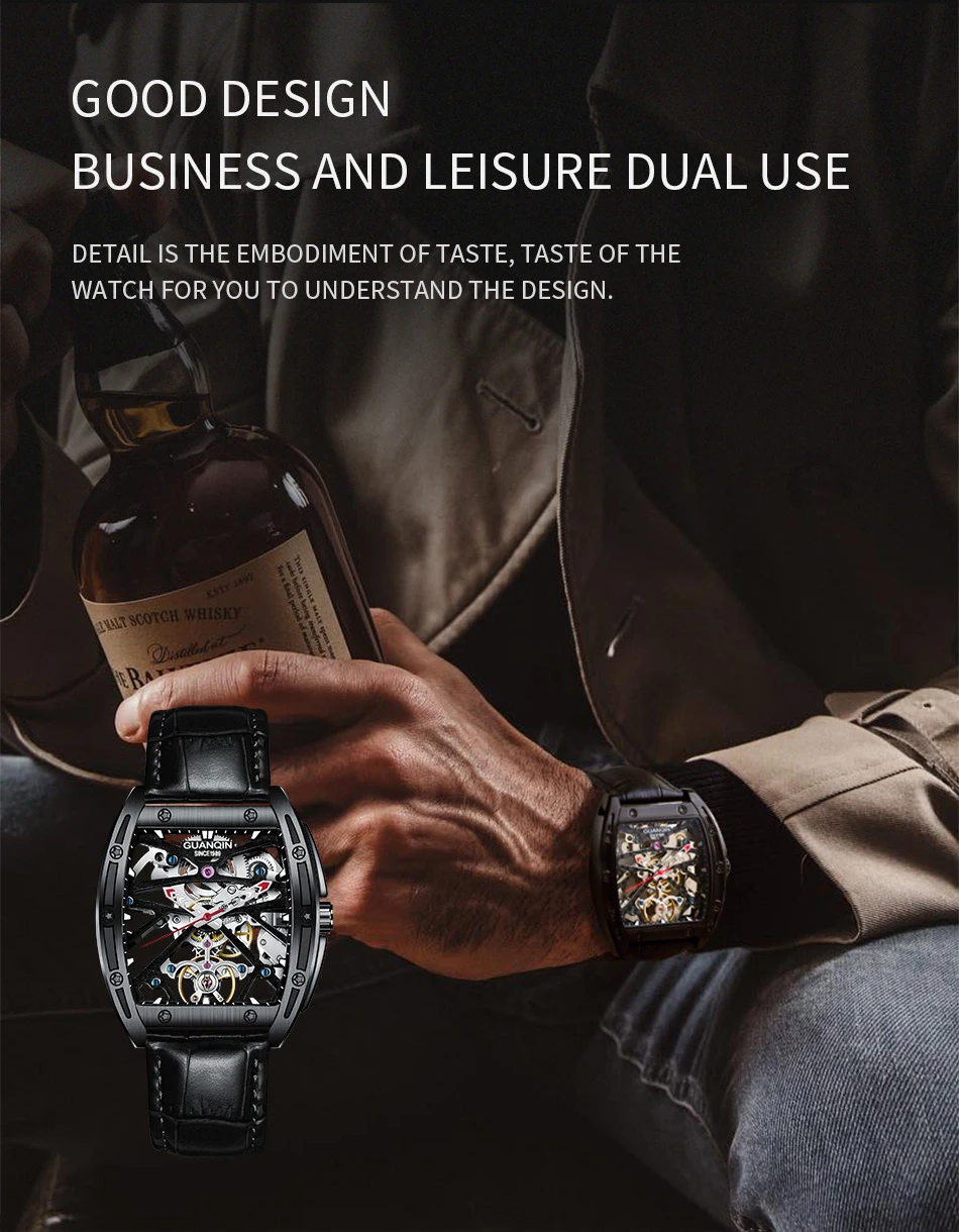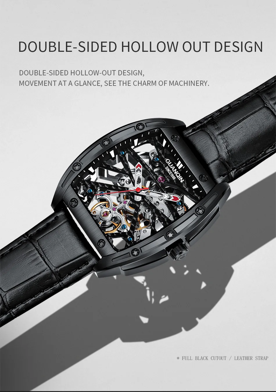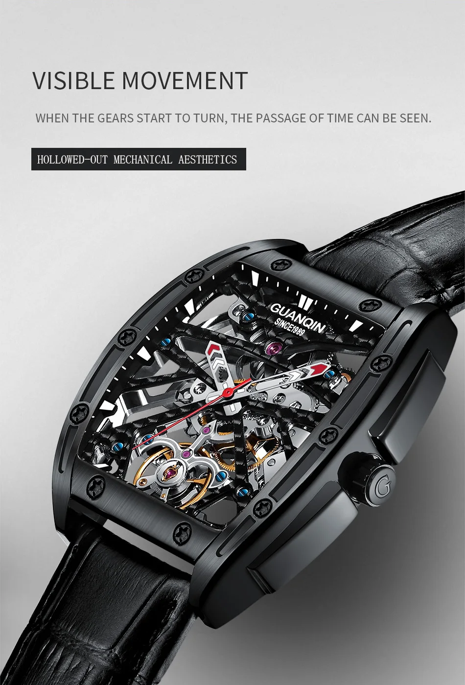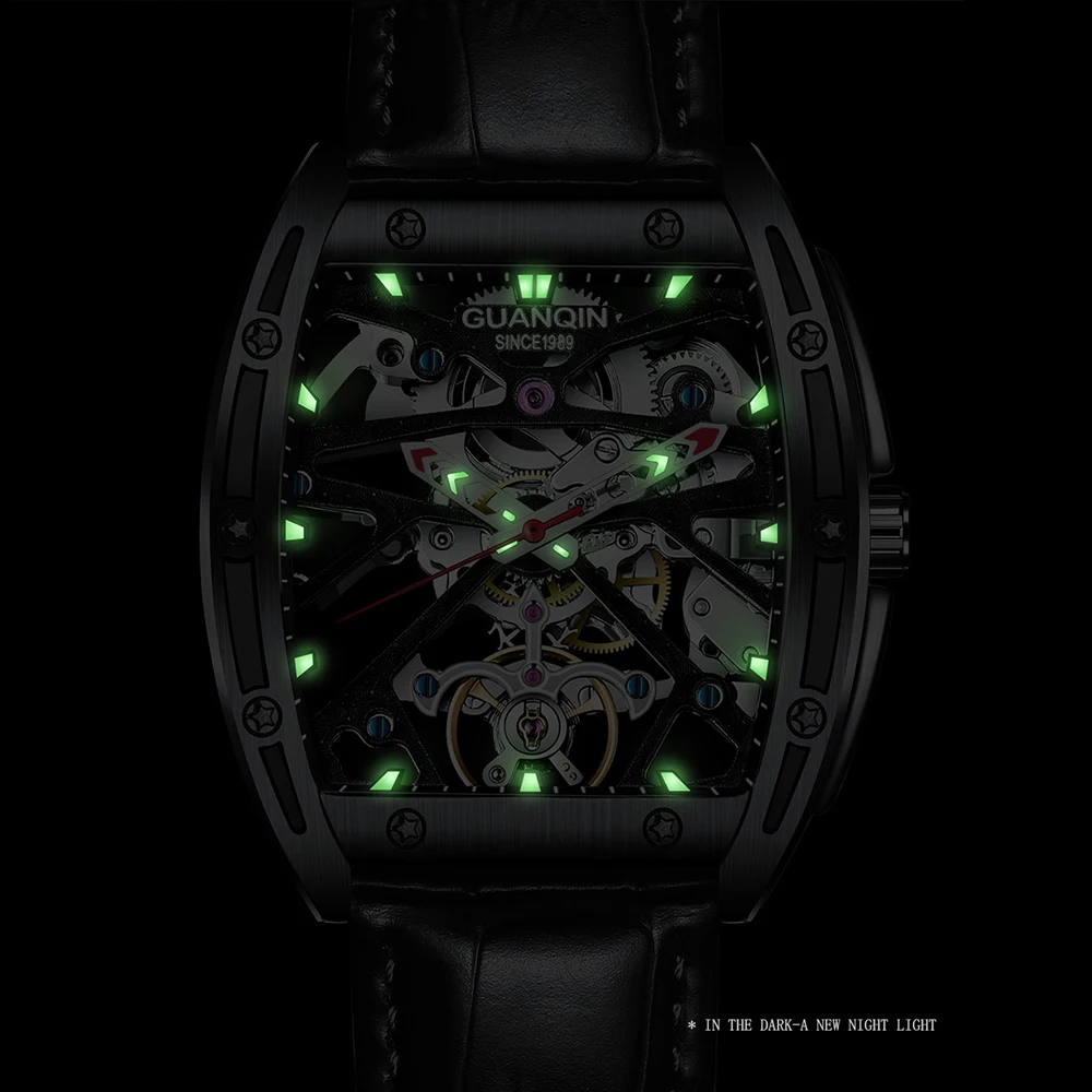 Мужские часы-скелетоны Tonneau, роскошные брендовые автоматические часы GUANQIN, светящиеся водонепроницаемые часы с кожаным ремешком, новинка 2021