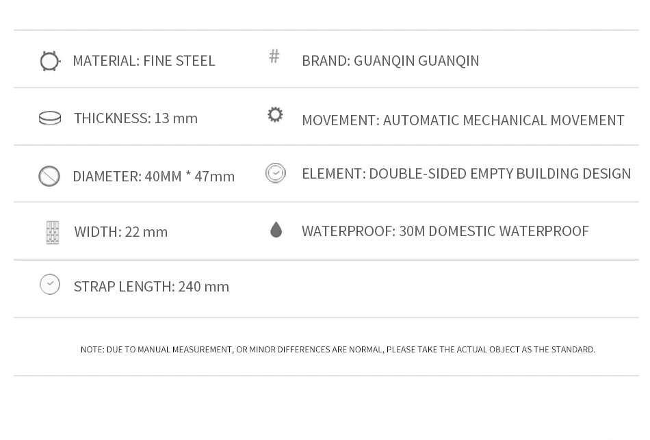 Бренд: GUANQIN Модель: 16147 Механизм: автоматическое механическое движение Толщина: 13 мм Диаметр: 40 мм * 47 мм Ширина: 22 мм Длина браслета: 240 мм Элемент: двухсторонний пустой дизайн здания Водонепроницаемость: 30 м Водонепроницаемость