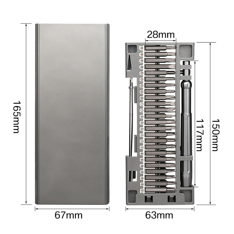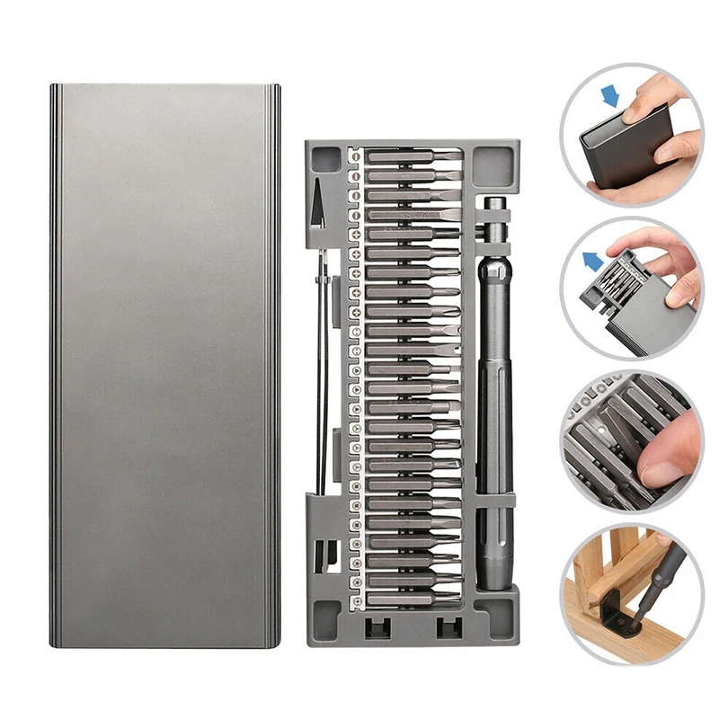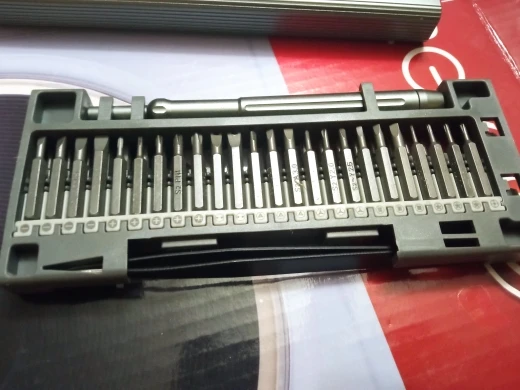 Потрясающе технологичный наборчик! Алюминиевый бокс в который вставляется пластиковый органайзер. В органайзере биты лежат каждая в своей подписанной ячейке и не выпадают благодаря сильному магниту. Сама отвертка маленькая и аккуратная, тоже намагничена для удержания бит. Небольшой люфт в месте соединения с битой присутствует, на удобство пользования не влияет. В комплекте пинцет, которым удобно доставать биты. Отвертка и пинцет фиксируются пластмассовыми зажимами, насколько они долговечны трудно сказать, но пока все удобно. :)) Сами биты очень высокого качества, "Торксы" с дырочками, "минусы" есть всех размеров, можно хоть в часах копаться. :)) Точность изготовления сложных звездочек и крестов потрясающая! Набор реально высококласный и цена более чем выгодная. :))
