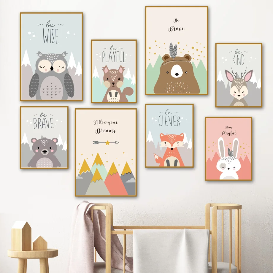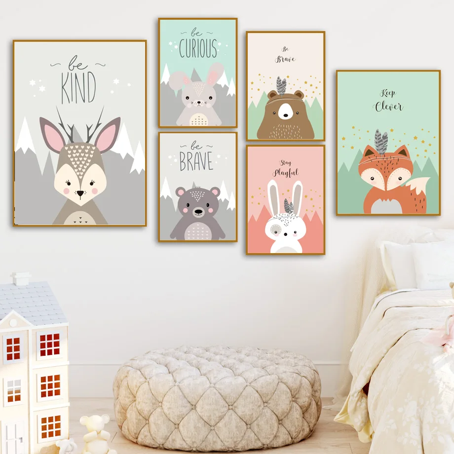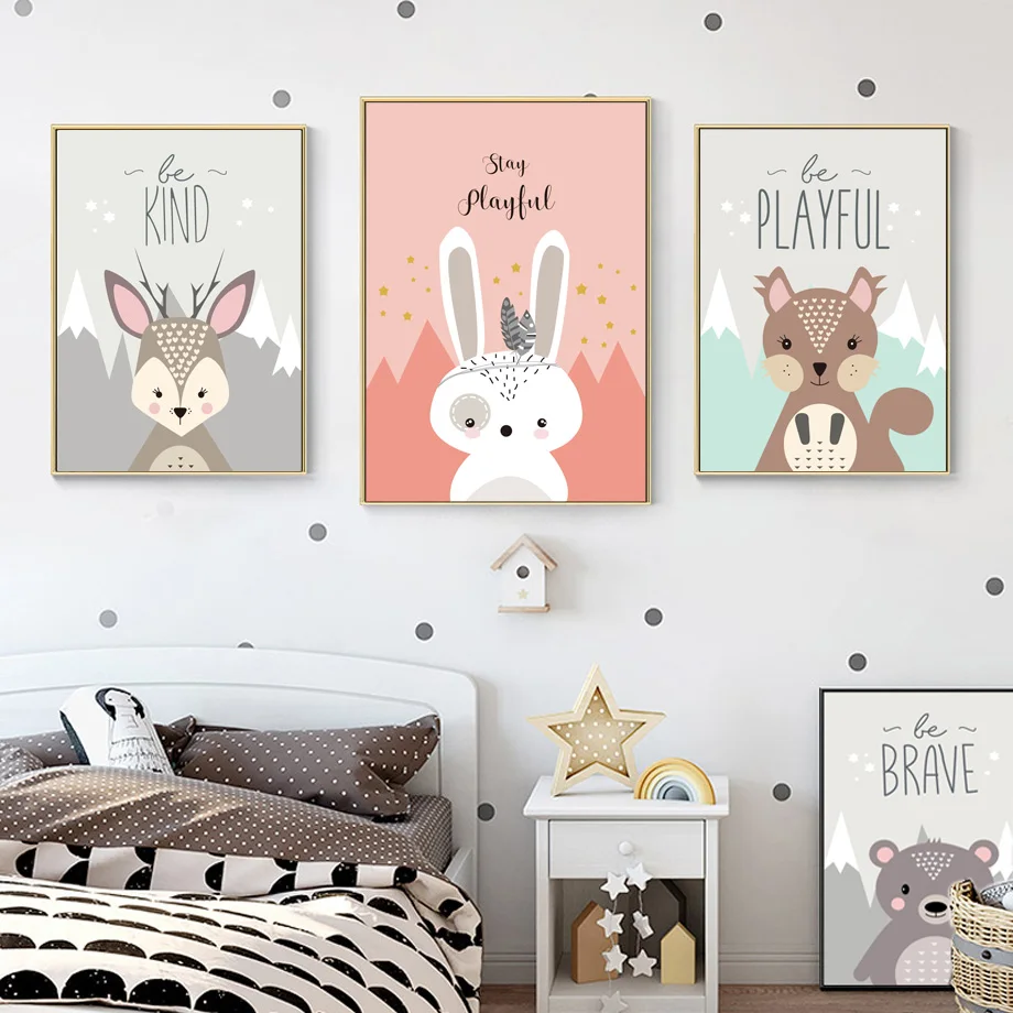 Картина в скандинавском стиле с милым медведем, Кроликом, лисой, оленем, художественный декор, картина для детской комнаты, Настенный декор, качественный холщовый постер, домашний декор
