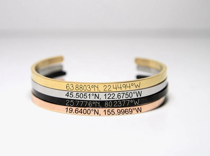 Индивидуальные персонализированные 4 мм ширина лазерной гравировки координаты браслет из нержавеющей стали регулируемые манжеты браслеты подарок для влюбленных