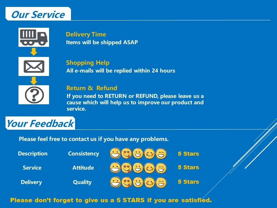 * Доступно множество способов доставки, таких как DHL, UPS, FEDEX, TNT, EMS и т. д. Доставка авиапочтой EMS/HK-это дешевый способ доставки, но медленный и неустойчивый. Иногда быстро, иногда медленно. Точная информация об отслеживании не может быть отображена онлайн сразу, когда покупатели выбирают эту доставку, пожалуйста, проявите терпение при ожидании товара.