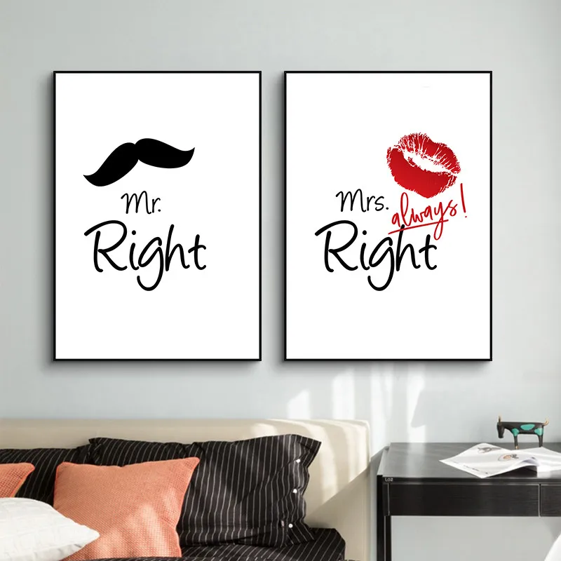 Картина на холсте Mr. Right Mrs Always Right Wall Art Print Moustach Red Lips для гостиной, Современный домашний декор TB146