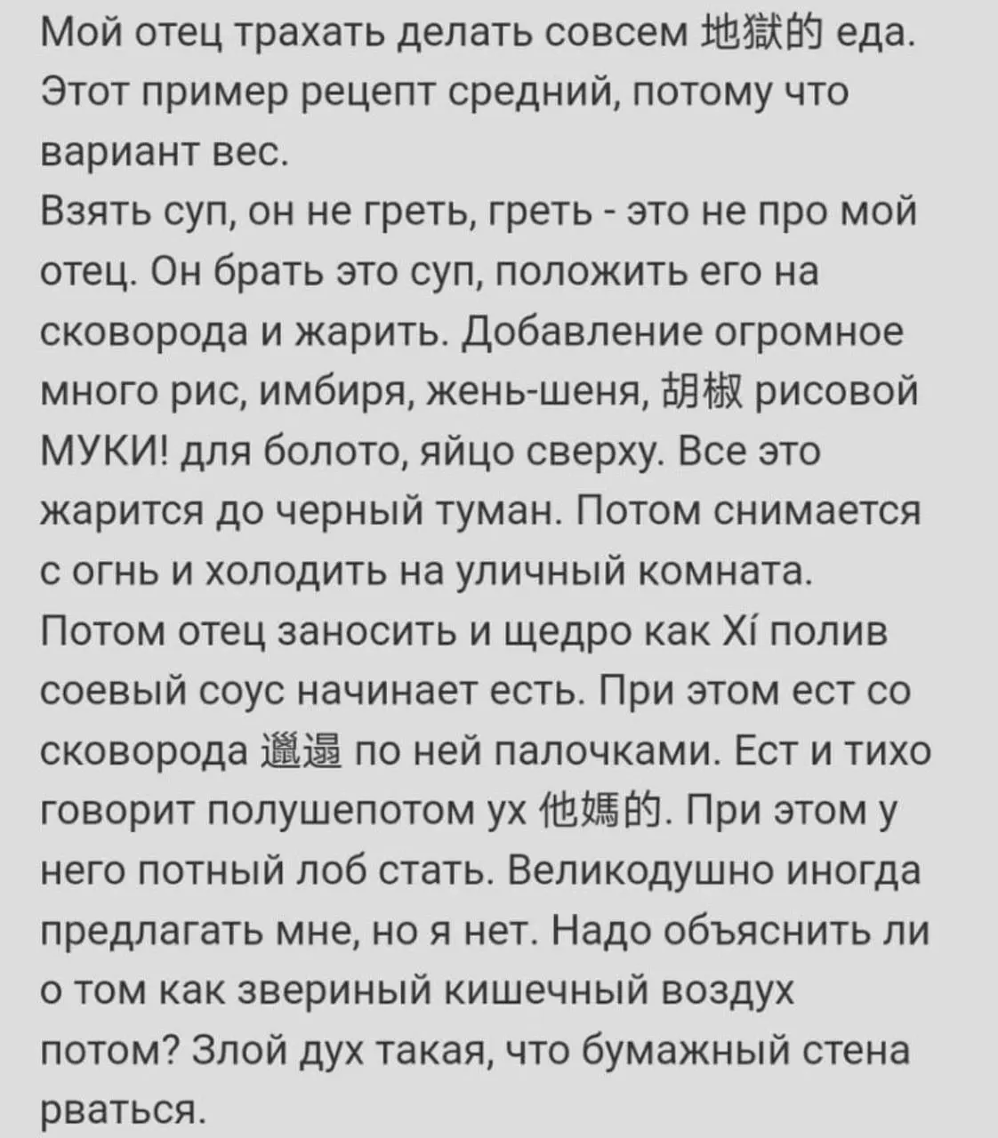 Я простой рабочий Николай город Питер. Жить Россия устать много налог мало зарплат, порций рис не хватать Читать на досуг идеи Мао из газет Жейминь Жибао Узнать про Китай. Стать интерес, как жить в Китай. Симпатизировать Xí - несравненный Китай лидер, поднятий экономика, густой шевелюра. Мой российский плешь Пу проигрывать шахматный партия мир. Хотеть видеть мой лидер Великий Xì Кормчий давать народ Китай двойной качественный порций рис, голодание отсутствие процветание достаток! Хотеть как в Китай, Удар!!