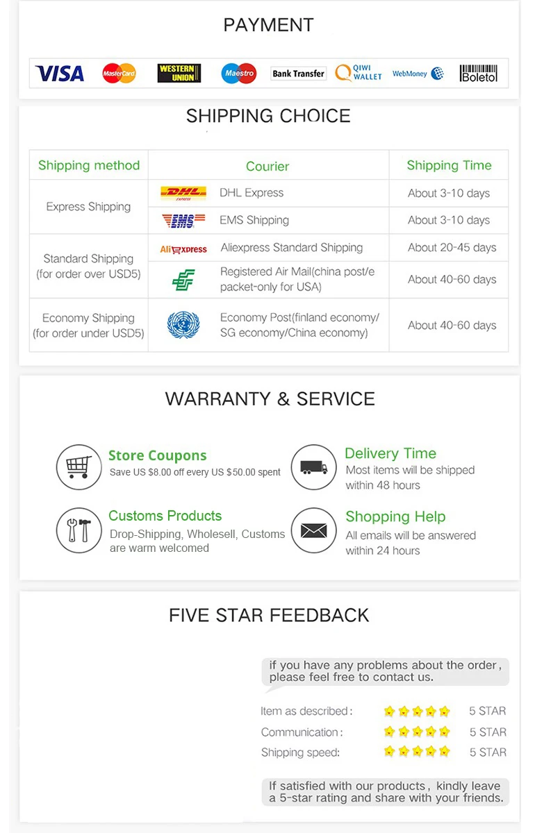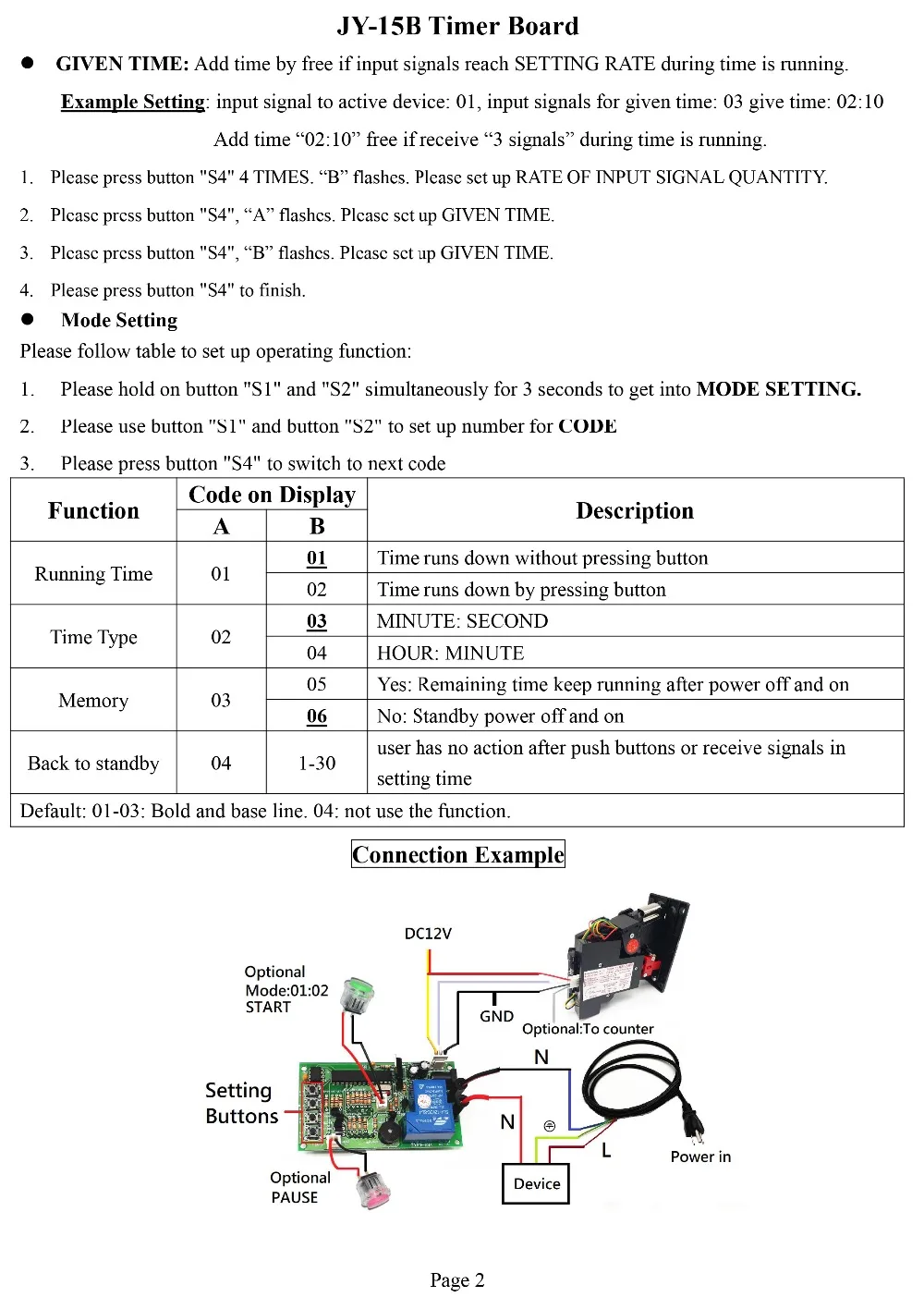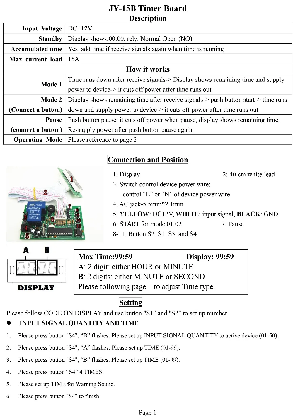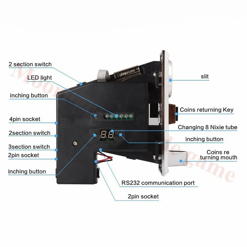 Руководство пользователяПроцесс настройки параметров(1)Одновременно нажимайте кнопки «Добавить» и «минус» примерно на три секунды, затем на светодиодный ном дисплее появится буква «А».(2)Нажмите кнопку «setup» один раз, и появится буква «E». Далее, нам кнопки, чтобы выбрать, сколько типы монеток вы хотели бы использовать; Затем нажмите кнопку «setup» снова, чтобы закончить.(3)После нажатия кнопки появится буква «H». Используйте кнопки «Добавить» и «минус», чтобы выбрать, сколько образцов вы хотите вставить позже. Затем снова нажмите кнопку «setup» для завершения.(4)После нажатия кнопки появится буква «P». Используйте кнопки «Добавить» и «минус», чтобы выбрать необходимое количество выходных сигналов/импульсов. Количество ограничено 50 раз. Затем нажмите кнопку «setup» для завершения.(5)После нажатия кнопки появится буква «F». Используйте кнопки «Добавить» и «минус», чтобы выбрать точность. Значение от 1 до 30, и 1 является наиболее точным. Как правило, 5-10 будут в порядке. Затем нажмите кнопку «setup» для завершения.(6)На данный момент вы успешно настроили первую монету. Пожалуйста, повторите все вышеуказанные процедуры, пока не настроите все монеты. Буква "А" появится снова после завершения всех вышеуказанных процедур.(7)Нажмите кнопку «setup», и появится буква «E». Наконец, выключите и включите питание. Настройка будет сохранена.Вы можете начать отбор образцов после завершения настройки. Пожалуйста, выберите не менее 20 монет. Процесс выборки влияет на точность селектора монет.Образец(1)Нажмите кнопку «setup», затем на светодиодный ном дисплее появится буква «A».(2)Снова нажмите кнопку «setup», затем появится буква «A1». Далее Начните вставлять образцы монет. Светодиодный дисплей покажет, сколько монет вы вставите. Буква «A1» появится снова после завершения.(3)Снова нажмите кнопку «setup», затем появится буква «A2». Затем начните пробовать 2-ю монету и повторите № 1 и № 2, пока не будут установлены Все монеты.(4)После завершения выборки нажмите кнопку «setup». Появится буква «А», затем выключите и включите питание. Теперь вы можете начать пользоваться им.Набор содержит:1 х мультимонетоприемник1 x плата таймера jy-15b1 штекер (США/Великобритания/ЕС на выбор)