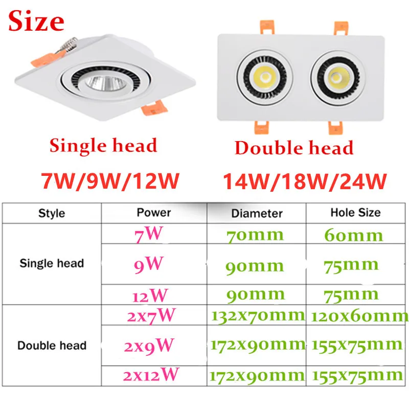 Квадратный Диммируемый Встраиваемый светодиодный вниз светильник 7 Вт 9W12W 14 Вт, 18 Вт, 24 Вт, светодиодный COB Точечный светильник украшения потолочный светильник AC85-265V Освещение в помещении светильник Инж