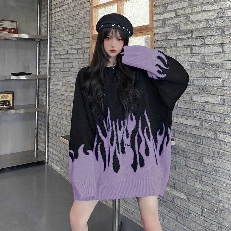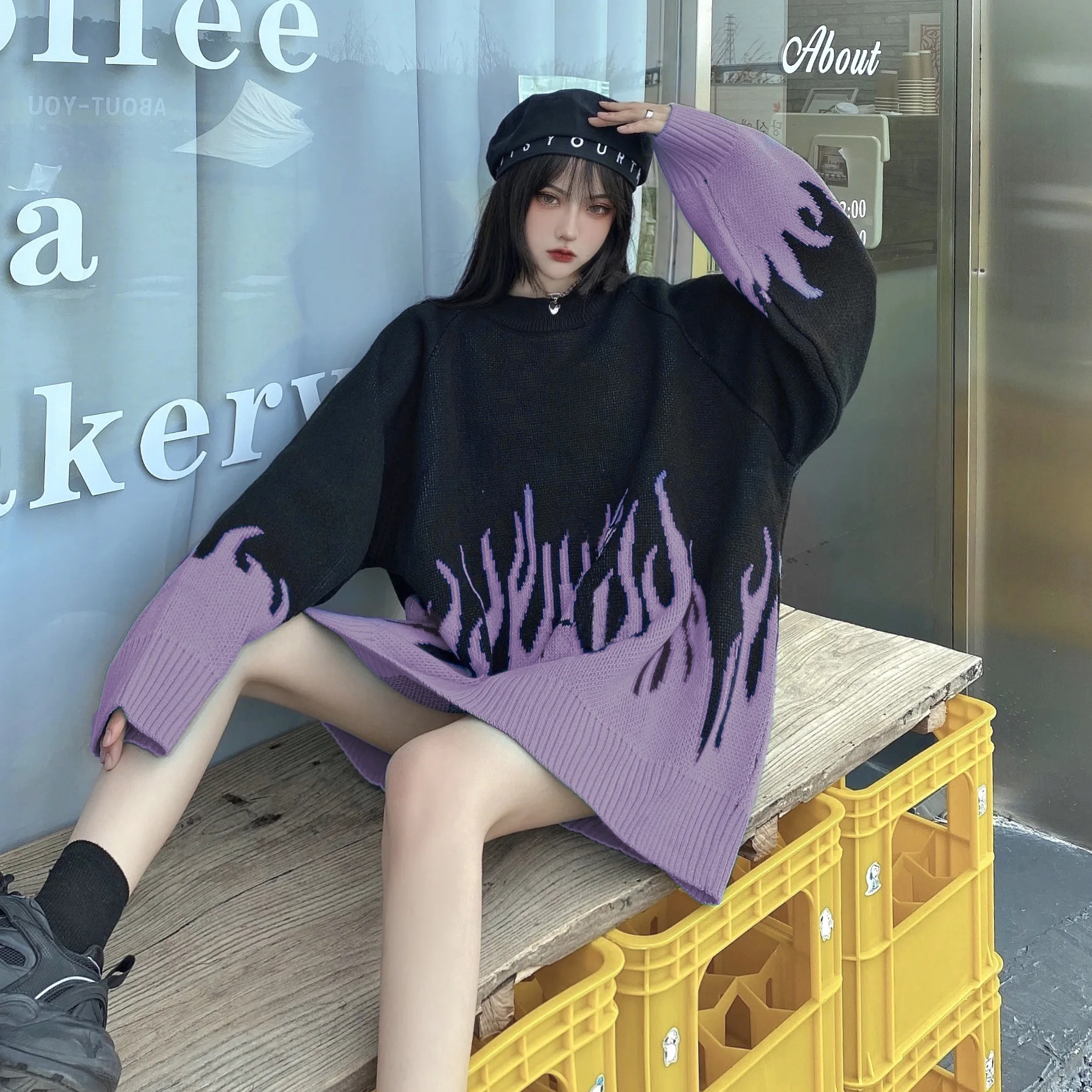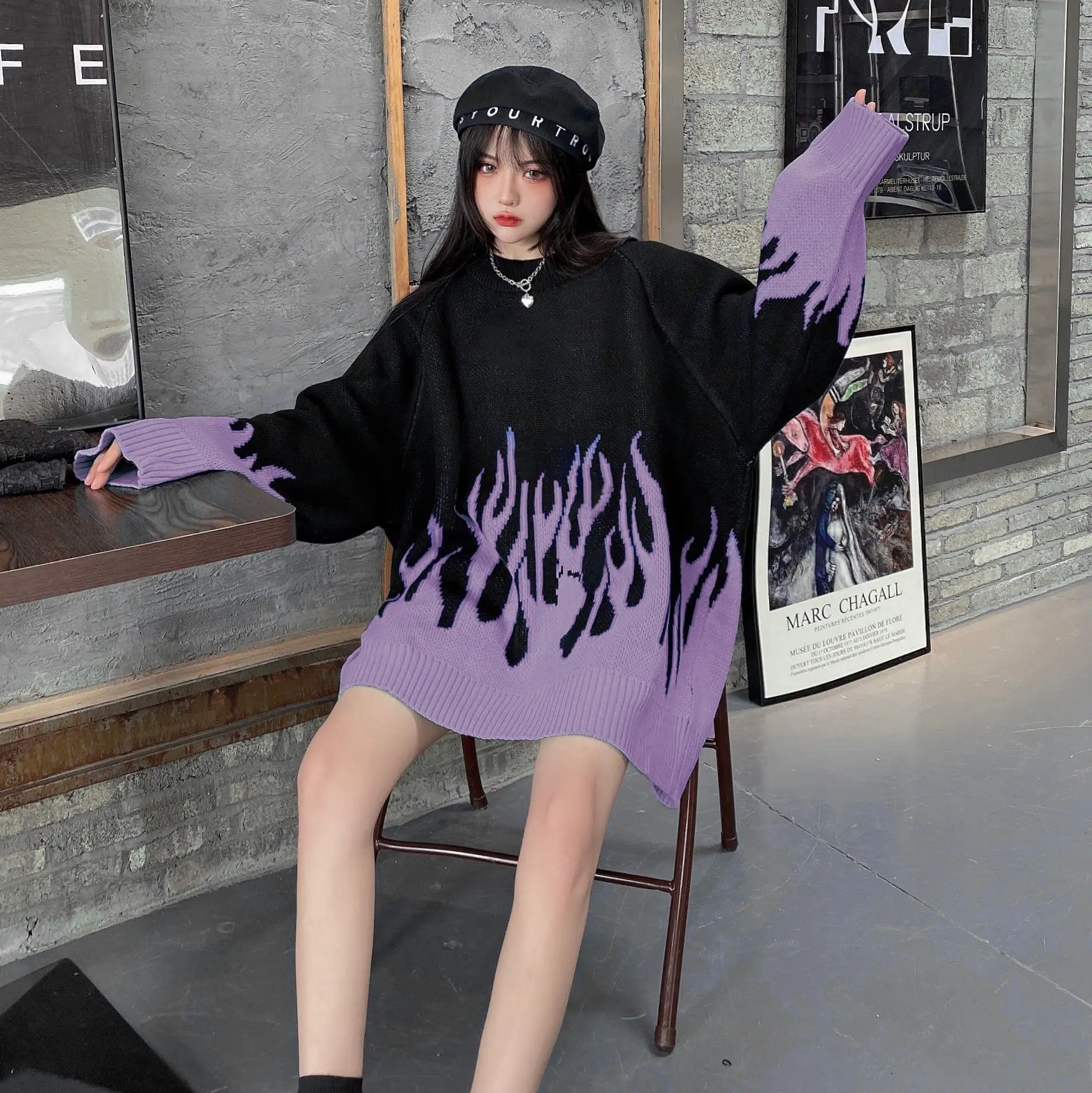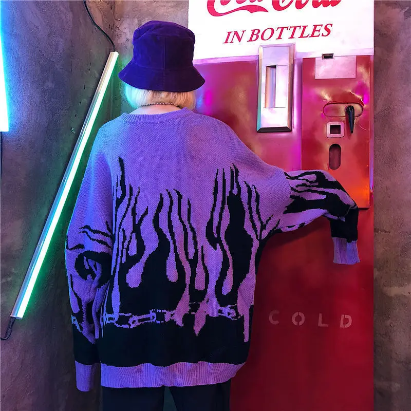 Вязаный джемпер с пламенем для мужчин, уличная одежда, Повседневный Кардиган в стиле хип-хоп с длинным рукавом, вязаный свитер, топы в стиле рок на весну-осень