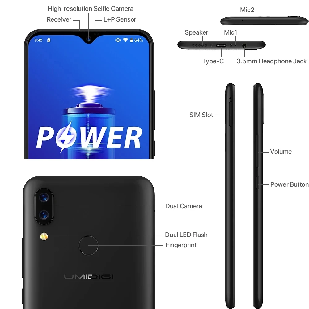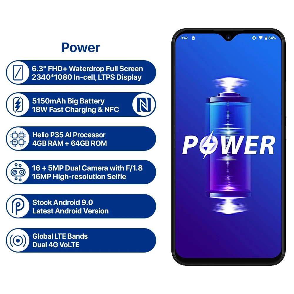 Смартфон UMIDIGI POWER 4G, экран 6,3 дюйма, 4 Гб ОЗУ, 64 Гб ПЗУ, Android 9,0, Восьмиядерный процессор Helio P35, 2,3 ГГц, 16 МП, сканер отпечатков пальцев, 5150 мА ч