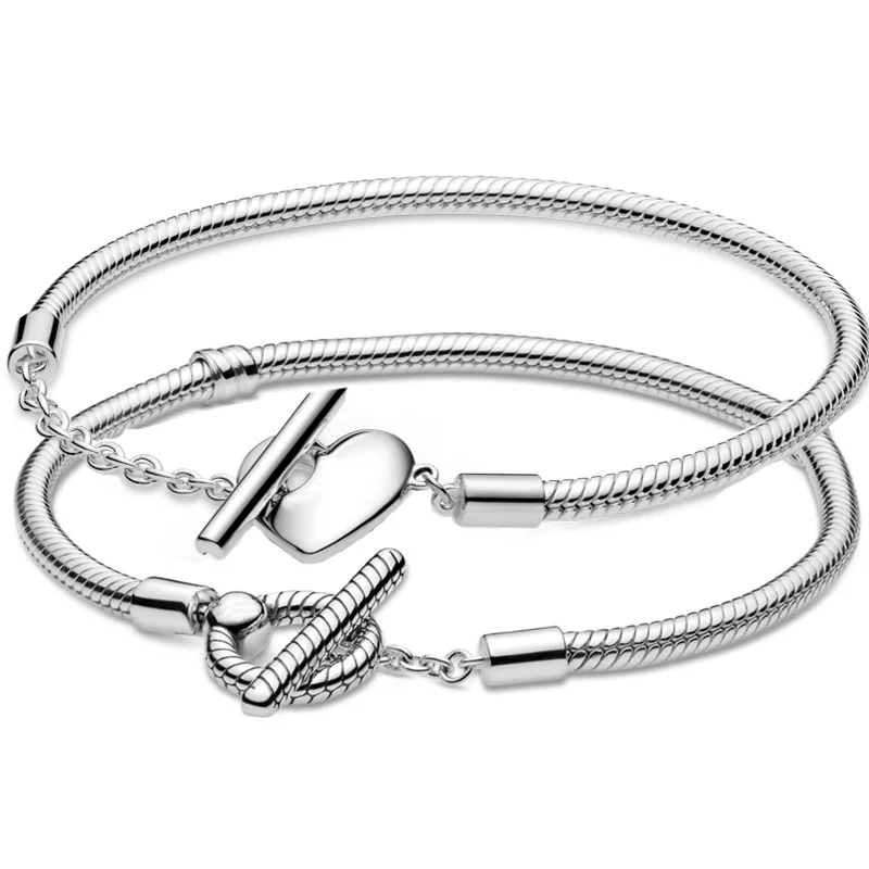 100% 925 пробы серебряные моменты сердце T-bar змея цепочка браслет подходит для европейского браслета бусины очаровательные DIY ювелирные изделия