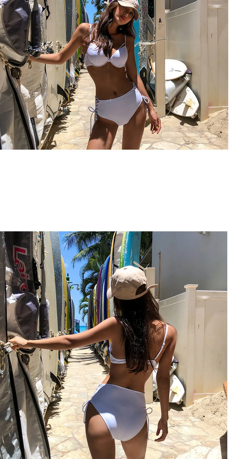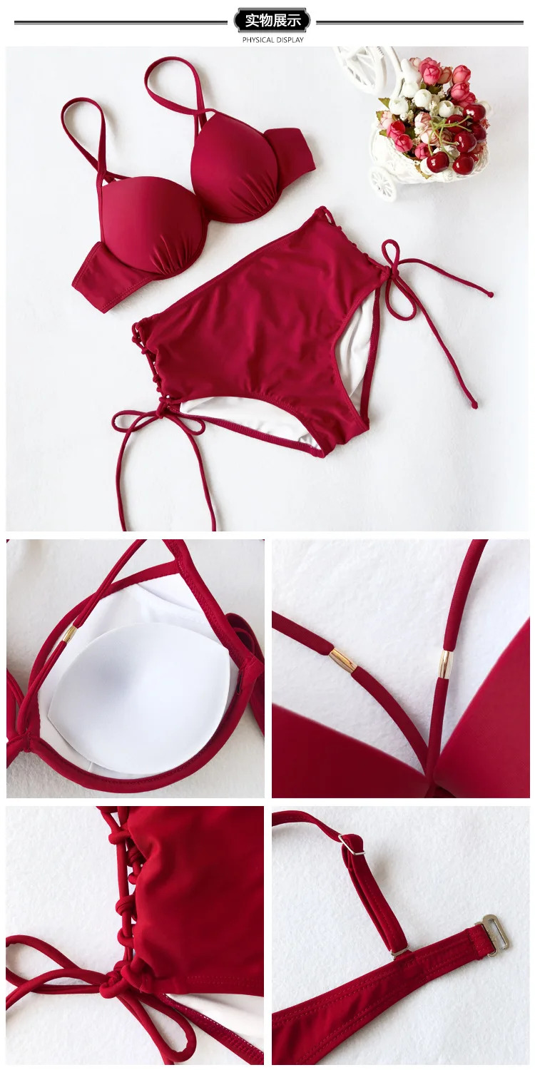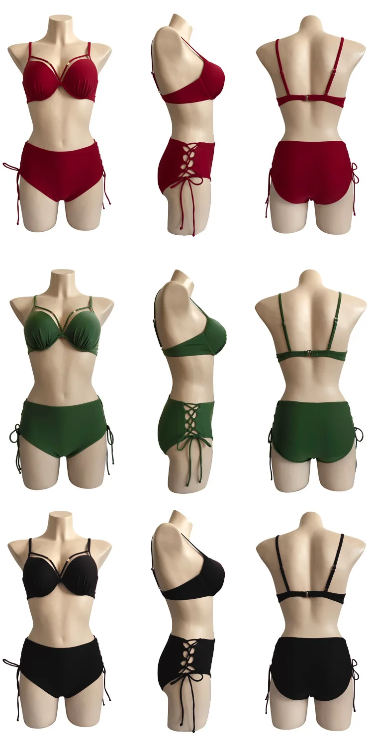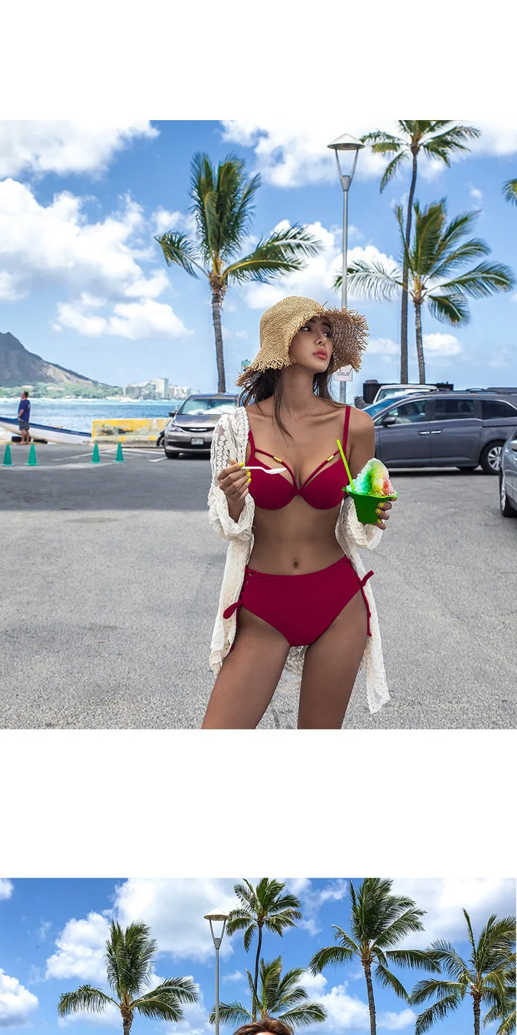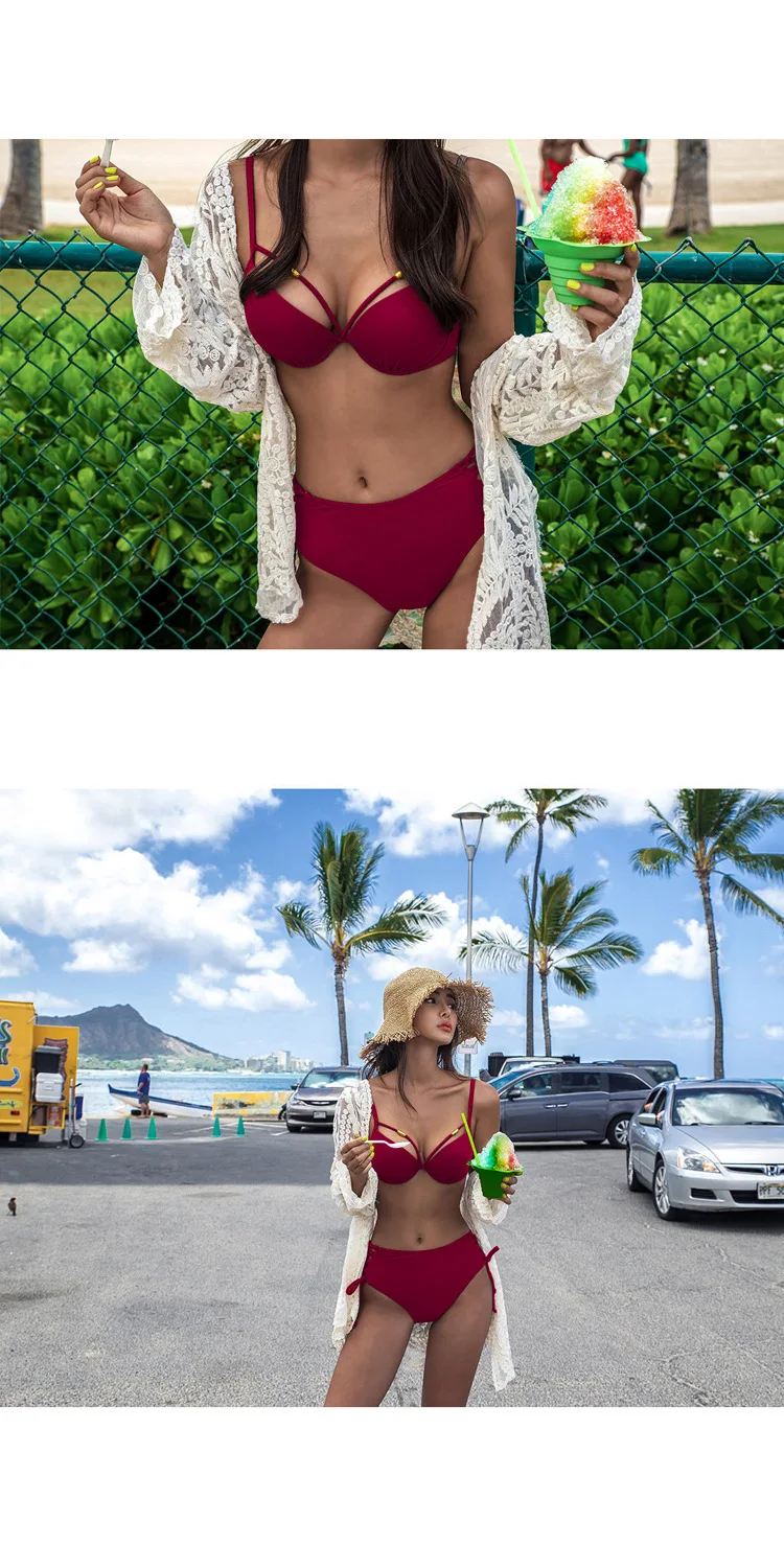 Купальник женский раздельный, пикантный сетчатый красный купальник бикини с завышенной талией, прикрывающий живот, маленькая грудь, стальная поддержка, присборенный уплотненный купальник, 2021
