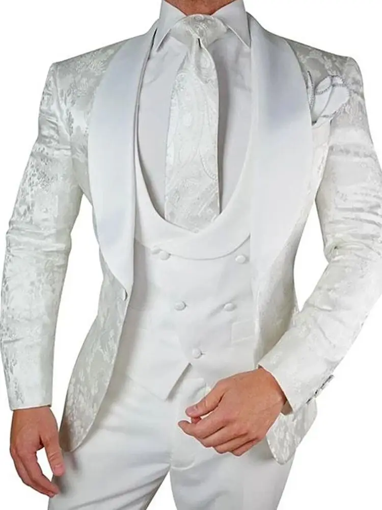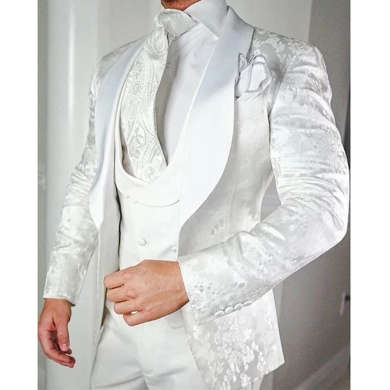 Свадебный смокинг для жениха с белыми цветами, 3 предмета, облегающие мужские костюмы с атласной шалью и лацканами, индивидуальный мужской модный костюм, куртка, жилет