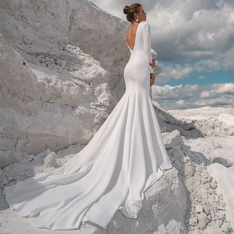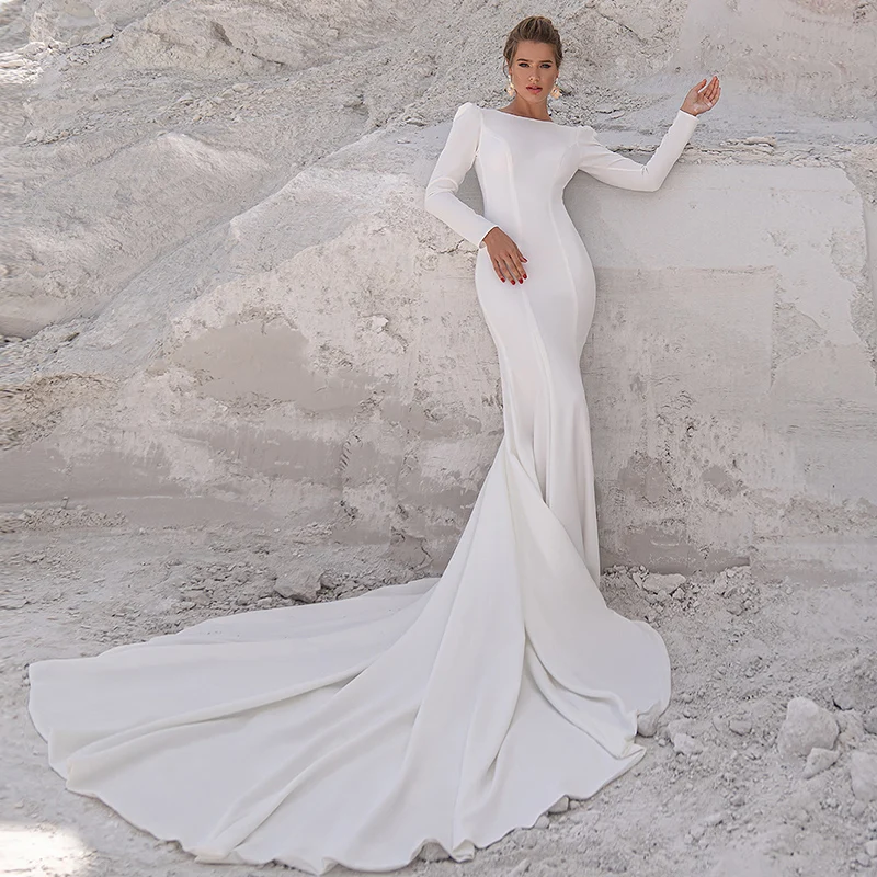 Женское атласное платье с длинным рукавом, белое простое свадебное платье с вырезом лодочкой, открытой спиной и шлейфом, на заказ, 2021