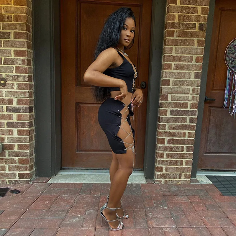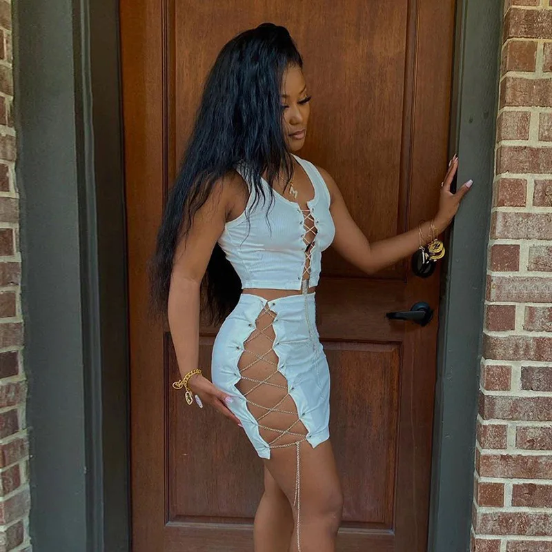 Женский комплект с юбкой на шнуровке Adogirl, укороченный топ без рукавов и мини-юбка с люверсами, комплект для ночного клуба, спортивный костюм