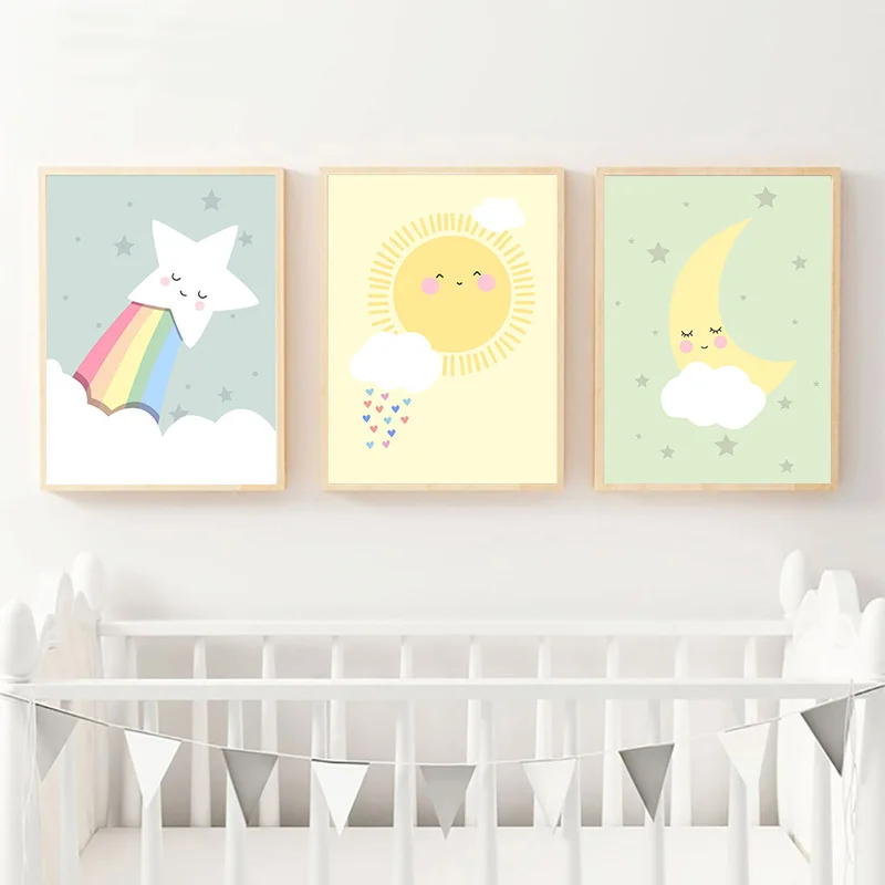 Картина в скандинавском стиле с изображением солнца, луны, звезд, темных облаков, радуги, детская, мультяшная, настенная живопись, декоративная картина для детской комнаты