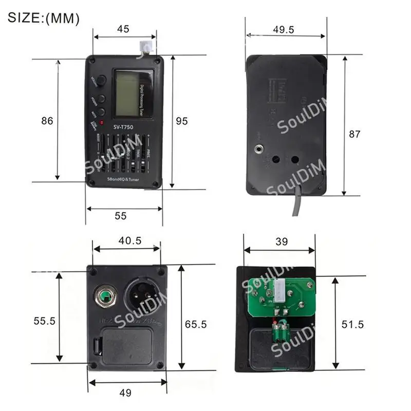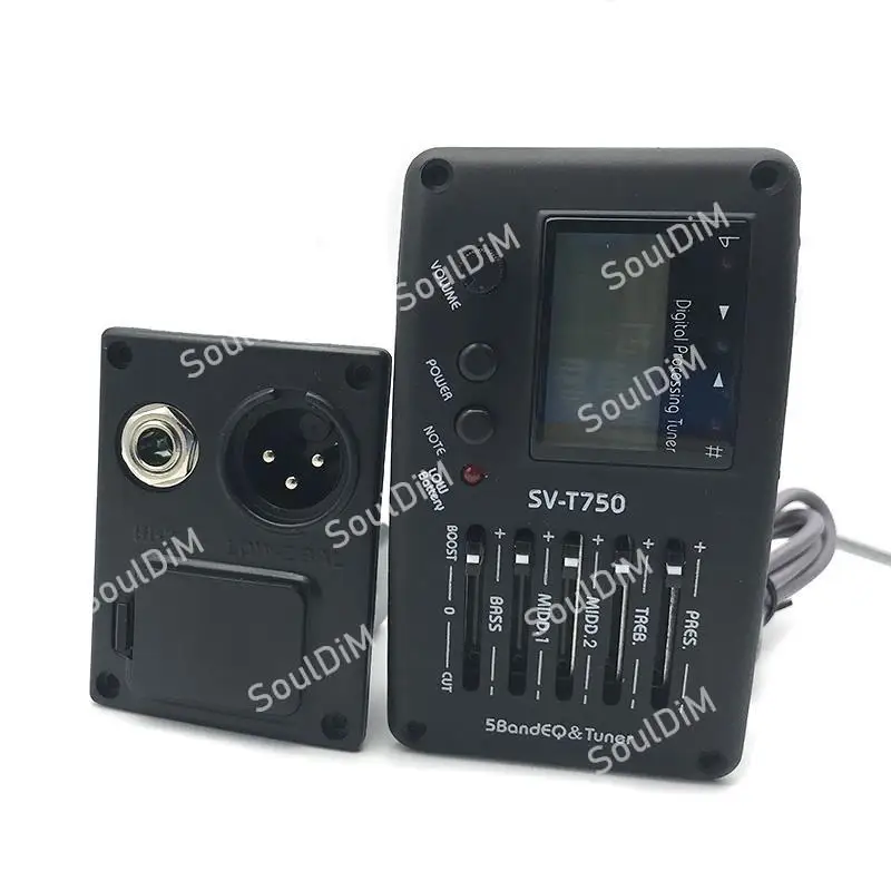 Описание SV-T750:Название продукта: 5 полосный эквалайзер Пикап100% новый и высокое качествоПрофессиональный гитарный и бас-тюнерРегулятор громкостиС громкостью, басами, middle1,middle1, ВЧ, pres ручками управленияЛегко читается метроном на ЖК-дисплее, система цифрового тюнера процедурПитание от аккумулятора 6F22 9V (не входит в комплект)Система ЖК-тюнераАвтоматический светодиодный индикатор проверки низкого заряда батареиРежим: 5 полосным эквалайзером с тюнеромРазмер и размер установки: как на картинке