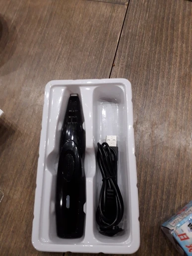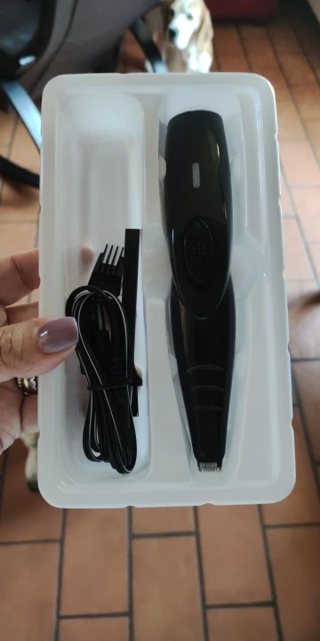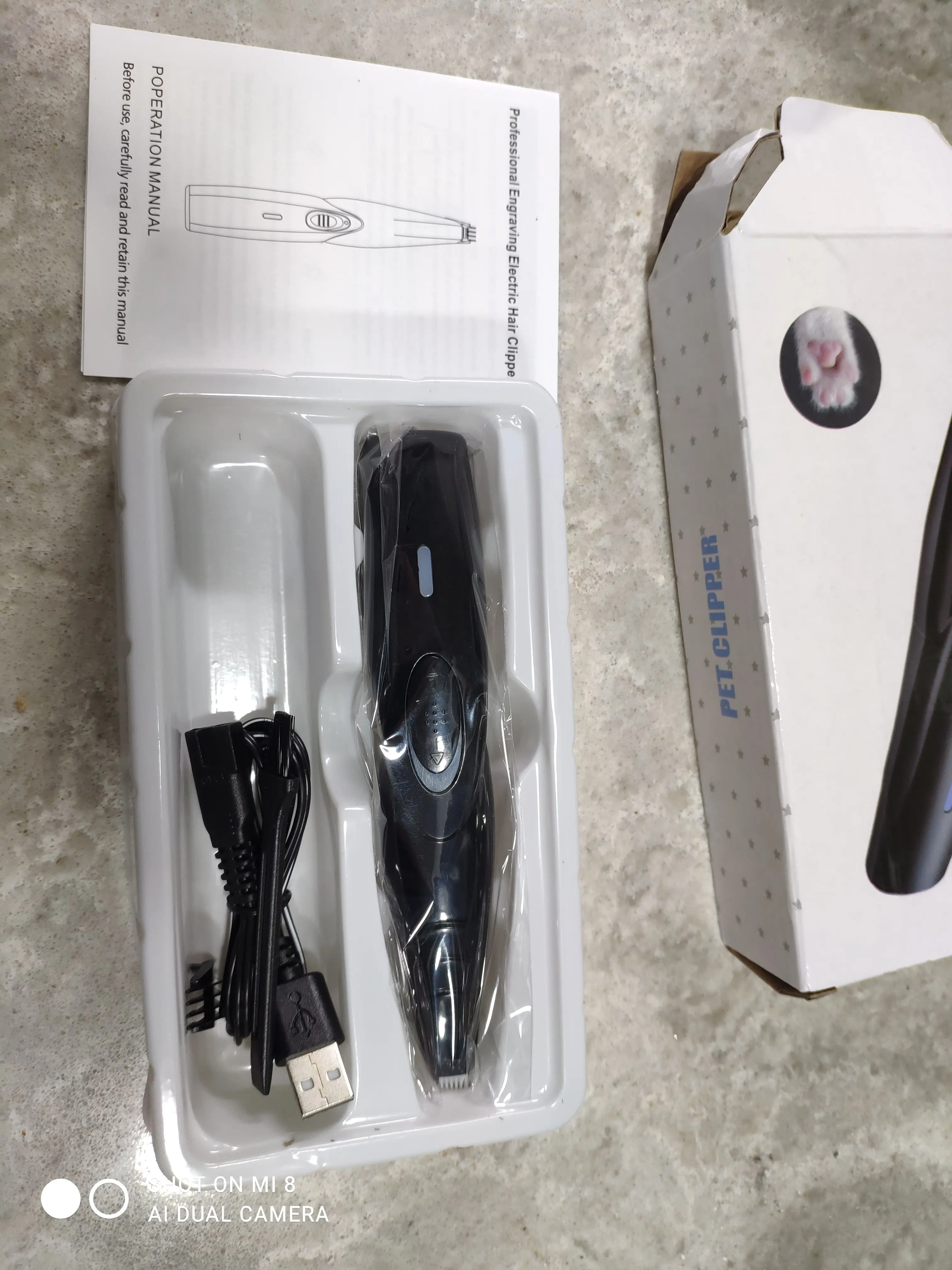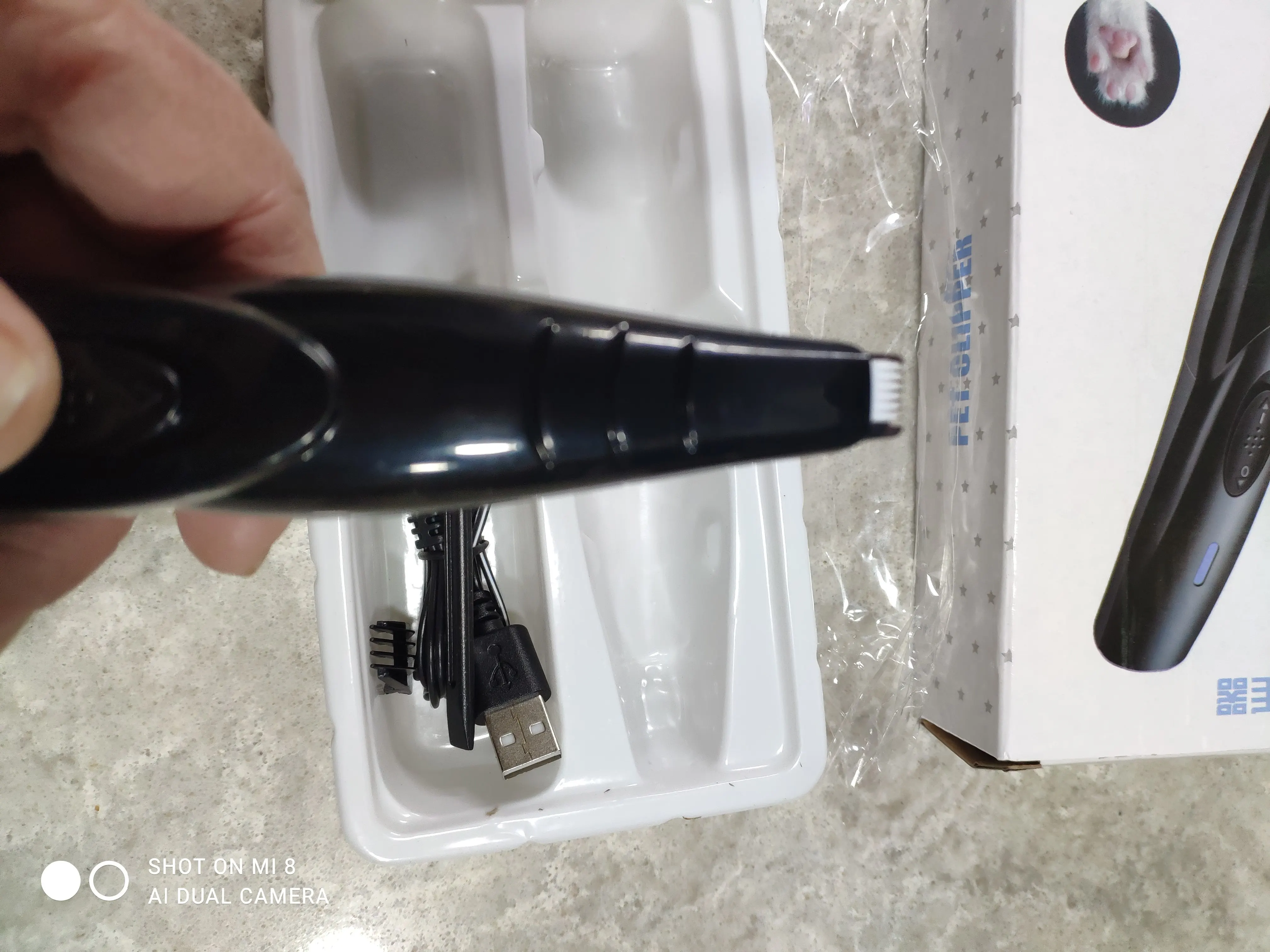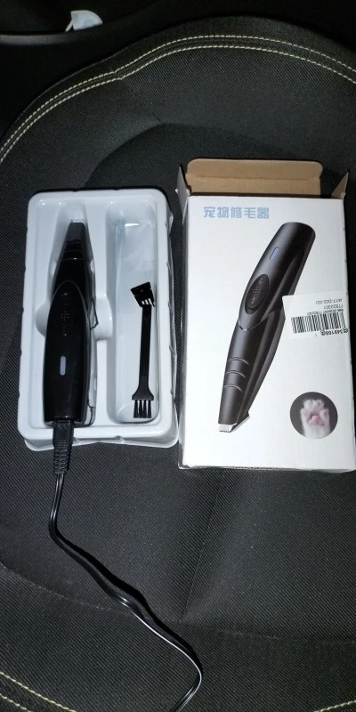 В коробке не оказалось щёточки,пришёл заряженный,коробка не запечатана,без целофана просто вложена в серый пакет.За это сняла звезду.Испытала на Йорке-супер.Очень тихо работает,мне понравился результат.