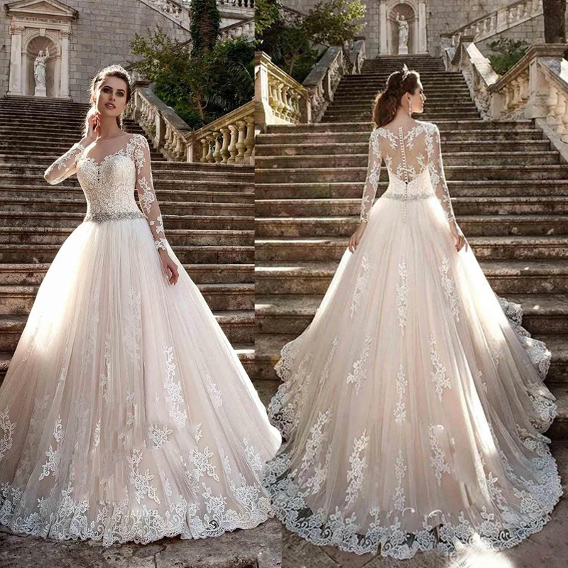 Женское кружевное свадебное платье It's yiiya, Белое Прозрачное платье с круглым вырезом, длинными рукавами и пуговицами на спине на лето 2019