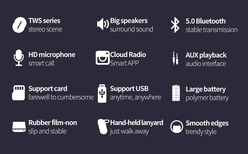 Емкость аккумулятора: 1800 мАч литиевая батареяВерсия Bluetooth: 5,0Динамик: 5 Вт * 2Расстояние передачи: около 10 мЧастотная характеристика: 100 Гц-20 кГцОтношение сигнал-шум: ≥ 90 дБРабочее напряжение: 3,7 VИскажение: <1%Напряжение зарядки: 5 в пост. ТокаПорт зарядки: Micro USBВремя разговора: около 3 чВоспроизведение музыки: около 8 чВремя работы в режиме ожидания: ≥ 30 днейВремя зарядки: около 2,5 hTWS: Включите Оба динамика одновременно, затем нажмите кнопку «M» ke