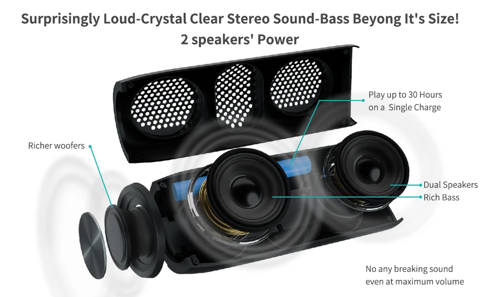 Стерео звук с полным басом --- динамик обеспечивает захватывающий звук с богатыми басами, средними и высокими частотами, динамическим звуком. Даже при максимальной громкости, в том же