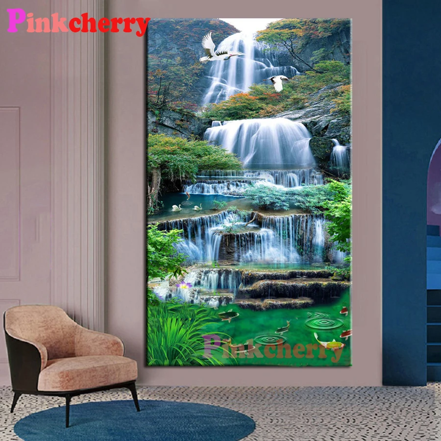 Алмазная живопись водопад пейзаж дерево птица 5D картина Стразы полная алмазная живопись Вышивка пейзаж рыбы кои P39