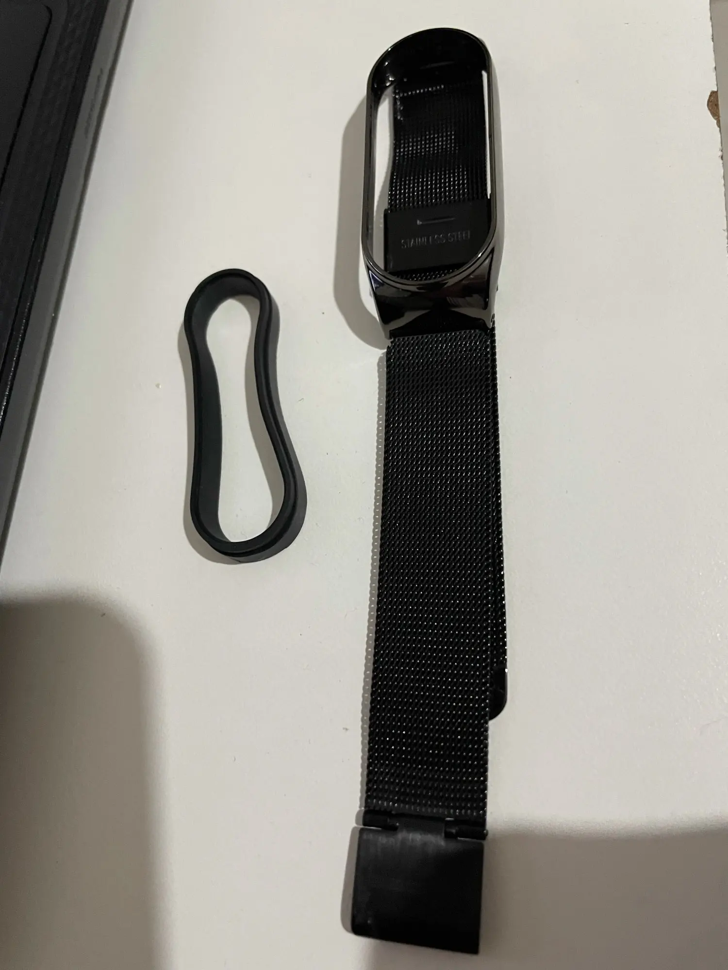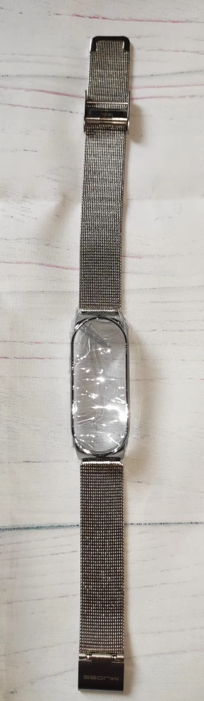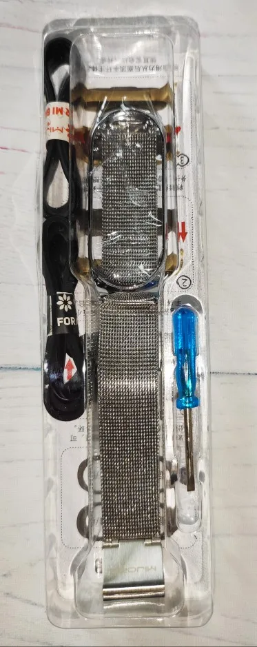 Отличная упаковка и комплектация. В коробке переходники на все модели mi band и отвертка для регулировки застежки. Пришел с небольшой царапиной на защелке (странно немного). Смотрится хорошо.