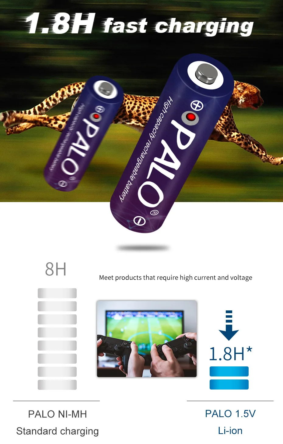 Емкость батареи AA: 2800mWhЕмкость аккумулятора AAA: 900mWh1. Бренд: PALO2. Устойчивость к высоким напряжение: 1,5 V3. Тип зарядки: AAA, AA. Литиевая батареяМатериал для защиты окружающей среды6. До 2000 циклов перезарядки7. Отличная высокая производительность разряда/слива8. Точная Замена для стандартных батарей AAA размера9. Высокая производительность при низкой температуре10. Более высокие Дренажные устройства.11. Это для портативного пульта дистанционного управления, часов и радиоприемников, электронных игр, дымовой сигнализации, беспроводного телефона, электрической игрушки и многого другого.