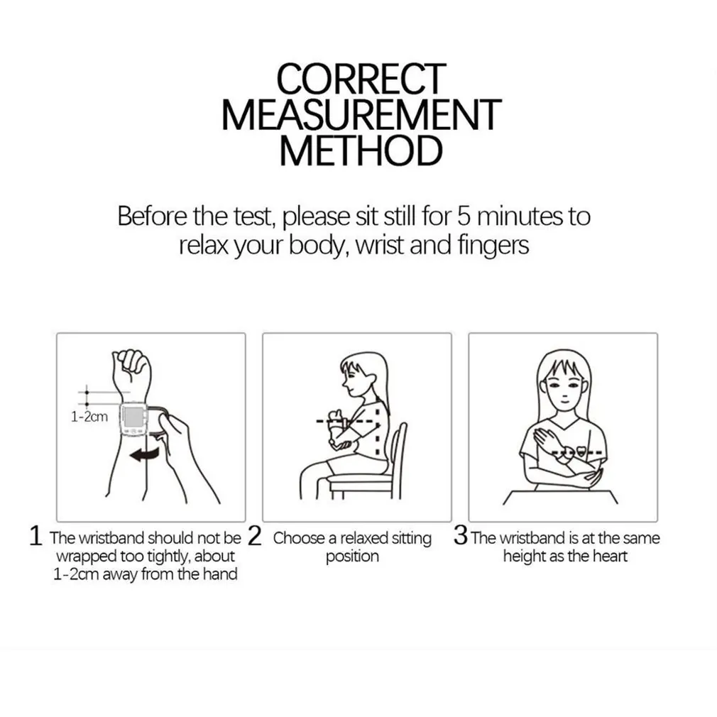Особенности:1. Быстрое и точное измерение артериального давления и пульса.2. Тип запястья модель с простым управлением всего 1 кнопочный.3. Идеально подходит для ежедневного мониторинга артериального давления.4. Автоматическое определение идеального надувания манжеты.5. Среднее значение для последних трех записей.6. Выбирается между мм рт. Ст. И кПа.7. Неправильный сигнал сердцебиения.Описание:Высокие и низкие показатели частоты пульса.Большой и четкий ЖК-дисплей, легко читается.Руководство по стандартам для оценки высокого кровяного давления.Предупреждение ющий мигалка сердца показывает, что монитор принимает измерения.Характеристики:Тип изделия: Артериальное давлениеПрименение: запястьеТип: Монитор артериального давления на запястье.Окружность запястья: 135 ~ 195 мм.Диапазон измерения:Давление: 20 ~ 280 мм рт. Ст.Частота пульса: 40 ~ 165 бит/минДавление: в пределах ± 3 мм рт. Ст.Частота пульса: в пределах ± 5% от показанийМатериал: пластикРазмер: 70*72,6*32,5 мм (Д * Ш * В)Источник питания: 2 щелочных аккумулятора AAA (не входят в комплект)Дисплей: ЖК-дисплейРазмер коробки: 90*90*89 ммЦвет: белыйСодержание упаковки:1 x монитор кровяного давления на запястье