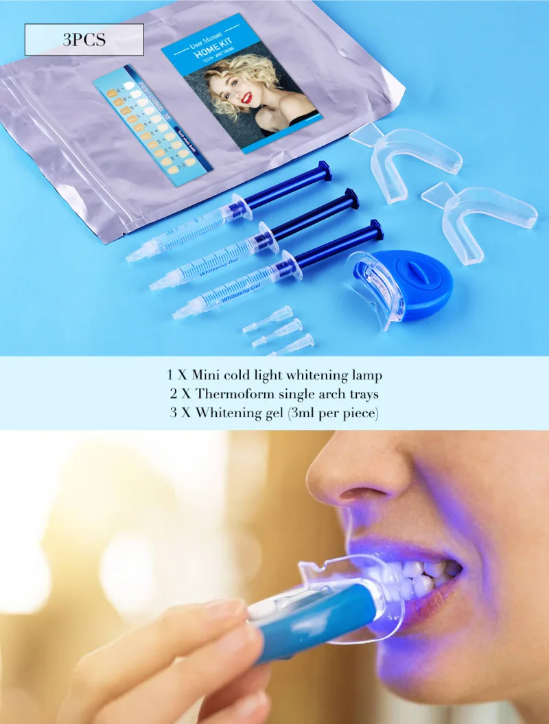 Снова Улыбайтесь уверенно:Наш Домашний Светильник для отбеливания зубов. Пять мощных Светодиодный ламп ускоряют работу нашей зубной отбеливающий гель для распада и растворения стойких пятен, вызванных едой, вином, курением и старением. Предварительно смешанные отбеливающие гелевые шприцы беспорядочны и просты в использовании в уединении вашего дома, без дорогих посещений стоматолога.