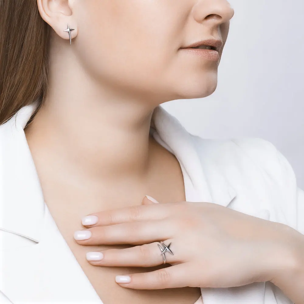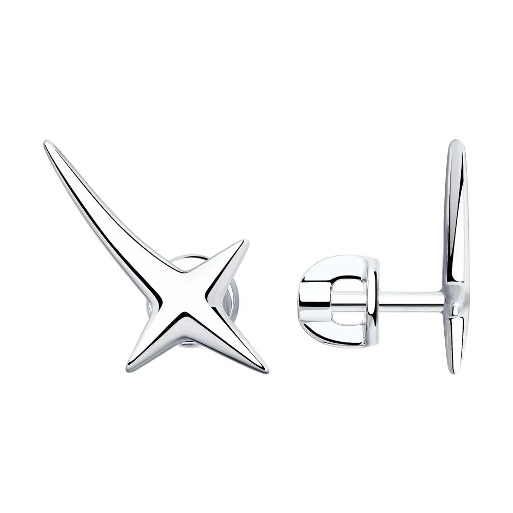 Серьги SKLV из серебраСеребряные серьги в виде запечатлённых в динамике летящих звёзд стали трендом не только благодаря макротендении на «космический» дизайн, но и благодаря своей форме. Это серьги-клаймберы, которые как бы «взбираются» по ушной раковине. Сегодня их популярность обусловлена поиском одновременно ультрасовременных и комфортных в носке украшений. Будь на стиле вместе с этой модной парочкой от SKLV!