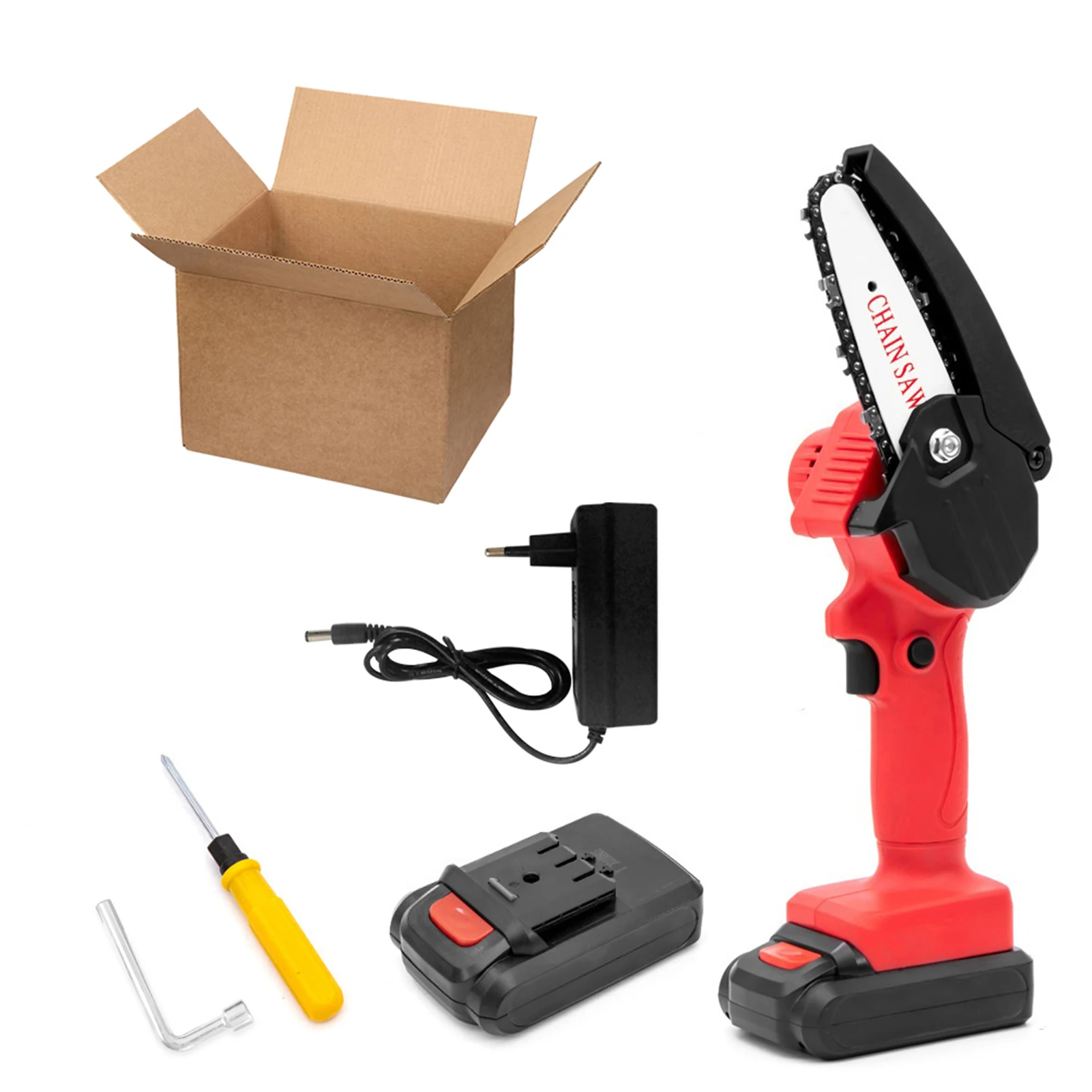 Беспроводная электрическая пила для обрезки является легкой и портативной для легкой работы с одной рукой, которая имеет широкий диапазон применения, такие как резка древесины, обрезка деревьев и многие другие садовые работы.Особенности:Аккумуляторная батарея в комплекте: бензопила оснащена двумя мощными перезаряжаемыми литиевыми батареями большой емкости, которые поддерживают вашу непрерывную работу.Мини-Беспроводная цепная пила: Электрическая цепная пила с литиевой батареей легкая и портативная, удобная для работы с одной рукой и простая в использовании.Двойной переключатель, безопасный для работы: помимо выключателя, он разработан с кнопкой блокировки, чтобы избежать случайного запуска, электрическая бензопила хорошо защищена с двойным механизмом защиты.Эргономичная ручка: с нескользящей ручкой, ручка очень удобна, чтобы уменьшить усталость рук после долгой работы.Медный сердечник двигателя: более прочный, низкое сопротивление, низкий уровень шума и меньше тепла в процессе резки.Цепь высокого качества: с высокой твердостью закаленной обработки, цепь более износостойкая, прочная и имеет высокую точность позиционирования, и она разработана с гарантией для предотвращения летающих опилок и мусора.Применение: идеально подходит для резки древесины, резки веток, обрезки растений, разделения дров и т. д.Характеристики:Тип вилки: ЕС/США (опционально)Материал: АБС + металлТип направляющей пластины: ЗвездочкаДлина направляющей пластины: 160 мм/6,30 дюймаСкорость цепи: 5 м/сСкорость без нагрузки: 3000 об/минИсточник питания: 2*21V 7500mAh литиевая батарея (входит в комплект)Вес изделия: 1200 г/2.65lbПосылка Вес: 1780g / 3.92lbРазмер посылка: 32*19*12 см/12,60*7,48*4,72 дюймаУпаковочный лист:1 * хост бензопилы2 * Батарея1 * Адаптер питания1 * гаечный ключ1 * Крестовая отвертка