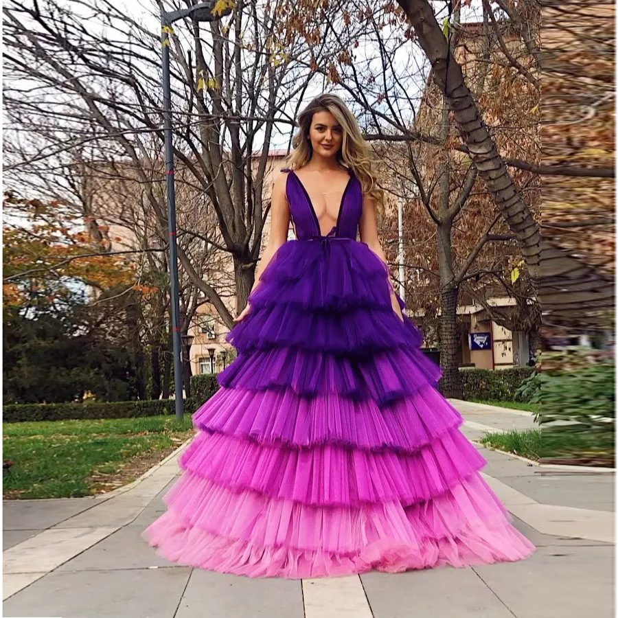 Винтажное Модное пышное платье темного цвета с градиентом, сексуальное платье без рукавов с глубоким V-образным вырезом, многослойное Тюлевое платье для выпускного вечера, доступные размеры