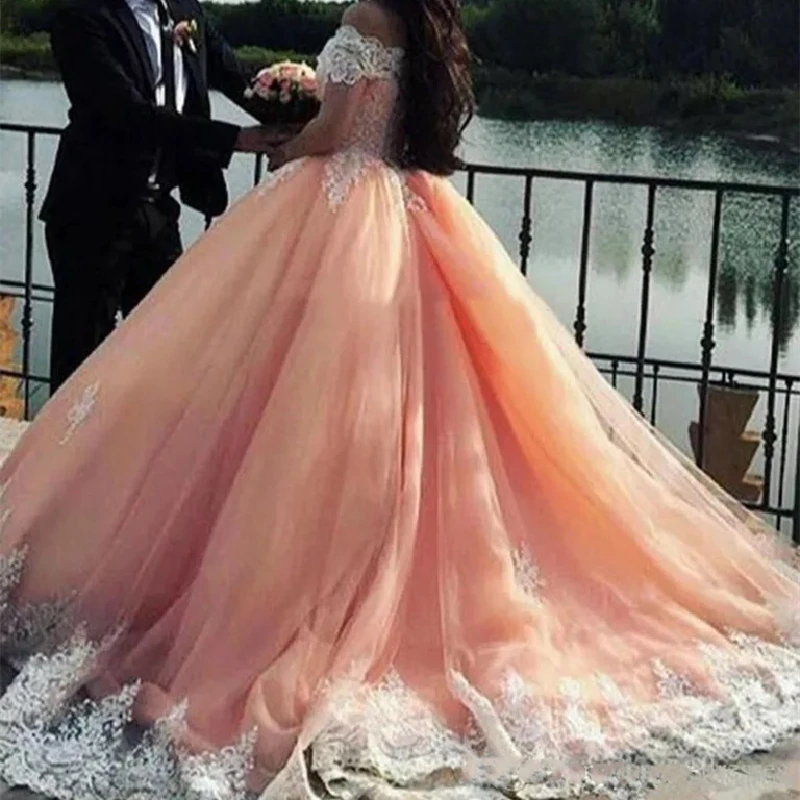 С открытыми плечами персик Бальные платья 2021 Пышное Бальное Платье с горловиной лодочка с кружевной аппликацией вечерние платье принцессы на праздник, сладкий 15 Quinceanera платье