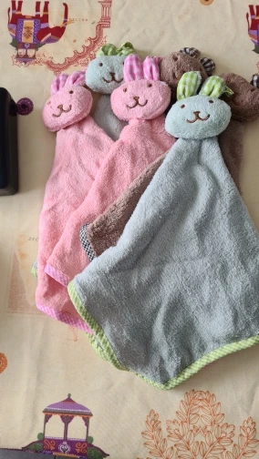 Полотенчики пришли быстро в сборной посылке. размер небольшой совсем. впитывает отлично. к рукам приятно, не цепляется, как из дешевой ткани. по виду думала, что будет зайчик, как на фото, в реальности ткань на ушах сэкономили и получился какой то мишка!
