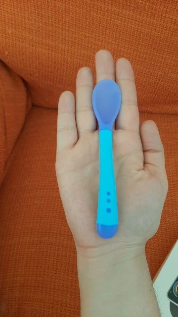 Хорошая стликоновая ложечка. Если еда горячая, ложечка белеет. Ложка мягкая, малышу не больно есть, особенно, когда режутся зубки. Даже если малыш прикусит ложечку, она не развалится, в отличие от пластмассовых. Очень хорошо учиться есть этой ложкой, если малыш промажет мимо ( по губе или по зубам), ему не больно.