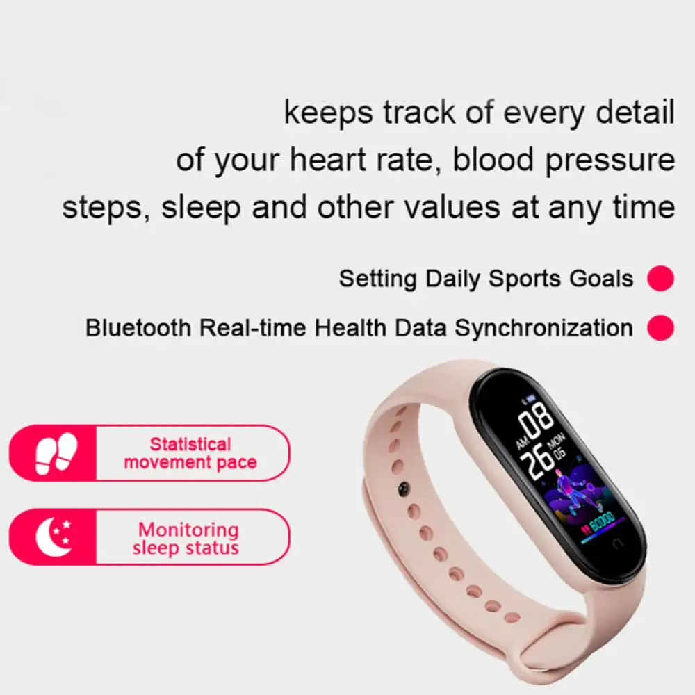 Тип: Смарт-часы M5Материал: ТПУ, АБС-пластик, поликарбонатЕмкость аккумулятора: 90 мАч (в комплекте)Совместимость с Bluetooth: 5,0Приложение: FitproСистемные требования: для Android 5,0/IOS 9,0 или выше0,96 дюймовый цветной экран IPS, одноточечная сенсорная кнопка, прозрачная, чтобы увидеть даже под солнечным светом.Спорт и здоровье: Синхронизация информации, качество сна, шаги, расстояние, калории, IP65 Пыленепроницаемость и водонепроницаемость, Многоязычность, управление камерой телефона.Поддержка динамического сердечного ритма, кровяного давления, контроля уровня кислорода в крови.Поддержка напоминания о звонках и напоминания о сообщениях.Водонепроницаемость: IP65, можно мыть руки, носить под дождем, но лучше не плавать.Встроенный большой аккумулятор, Сверхдолгий режим ожидания до 7 дней, работает 3-5 дней, быстрая зарядка в течение 2 часов (usb-зарядка, usb-кабель в комплекте).Браслет сменный.Теплые советы:Пожалуйста, убедитесь, что электричества браслета достаточно перед первым использованием, если электричество слишком низкое для загрузки, пожалуйста, заряжайте его как минимум 3-5 часов.Посылка включает в себя: