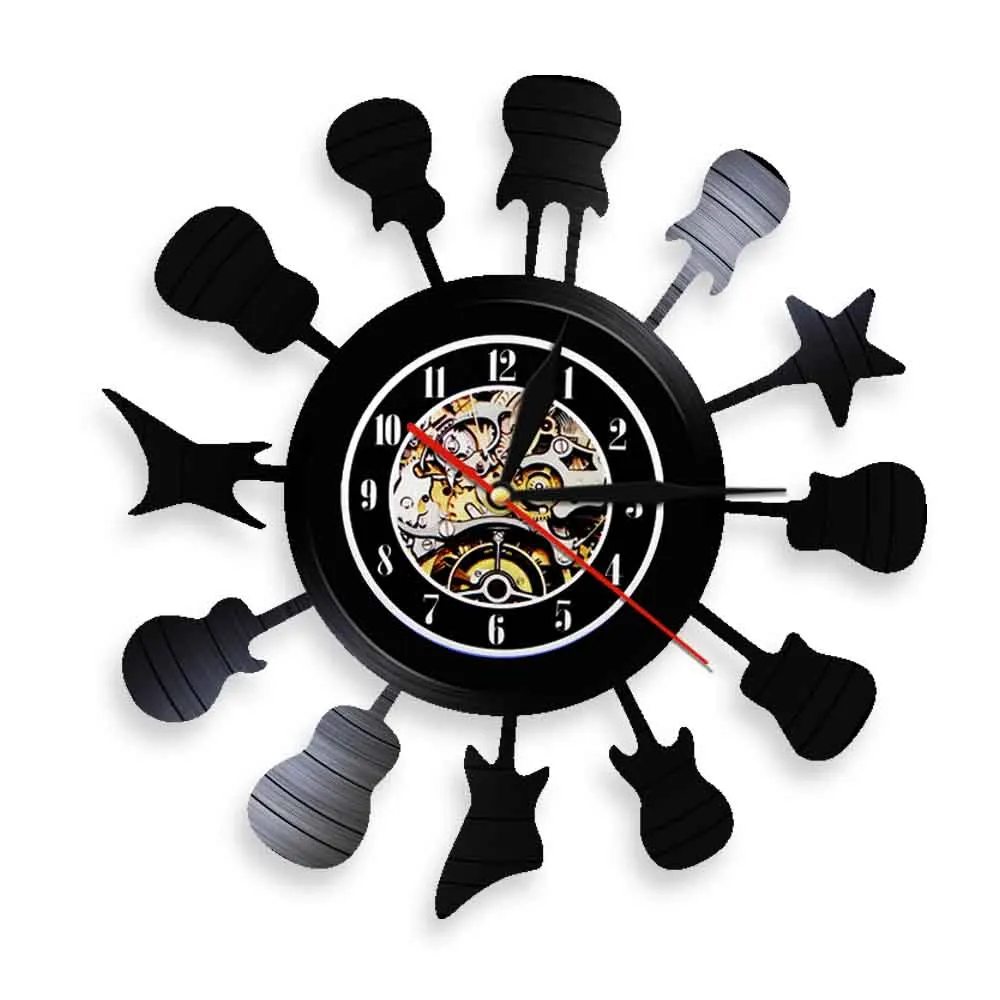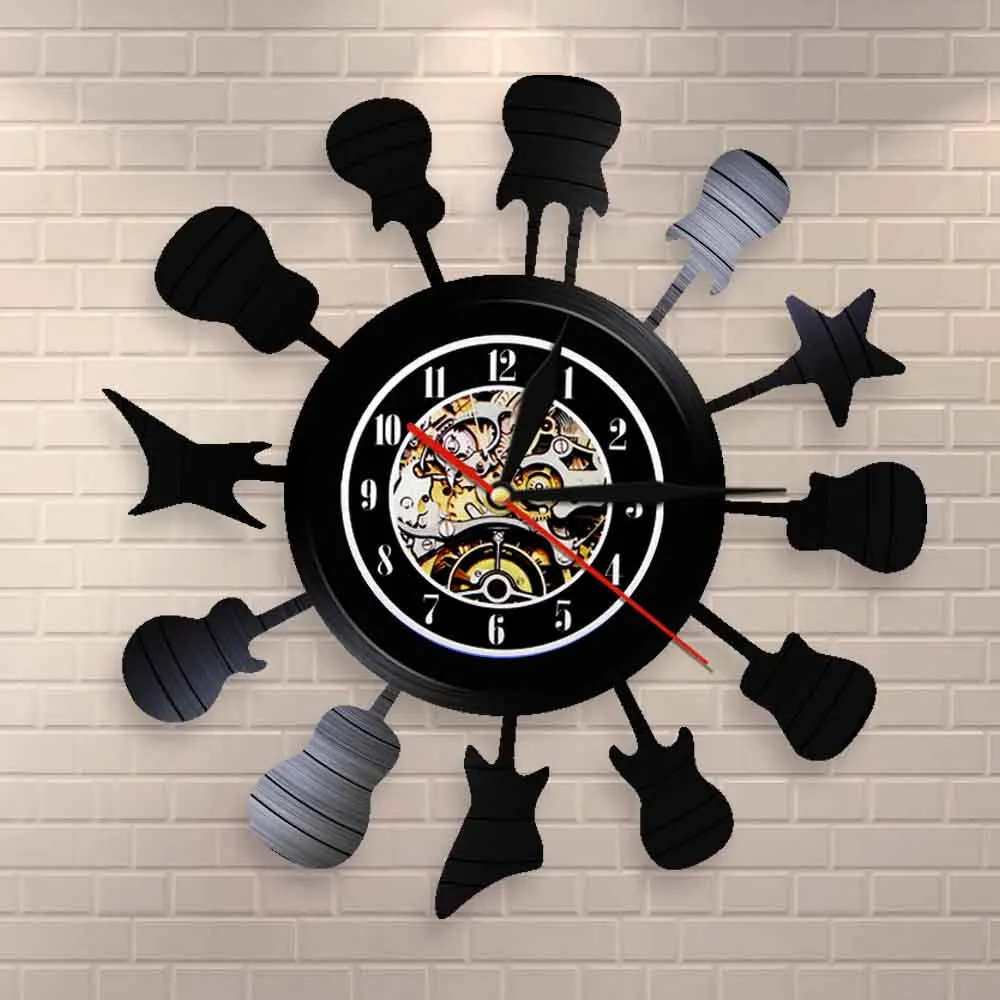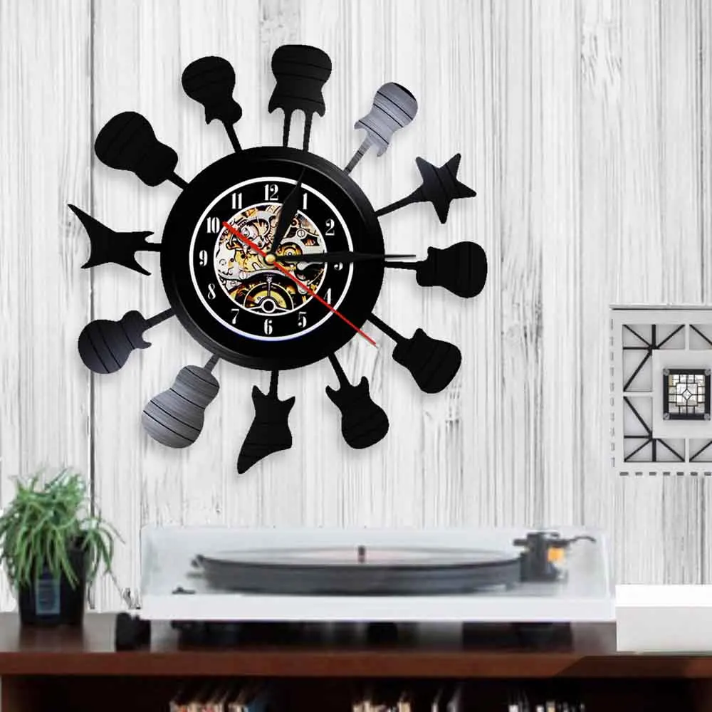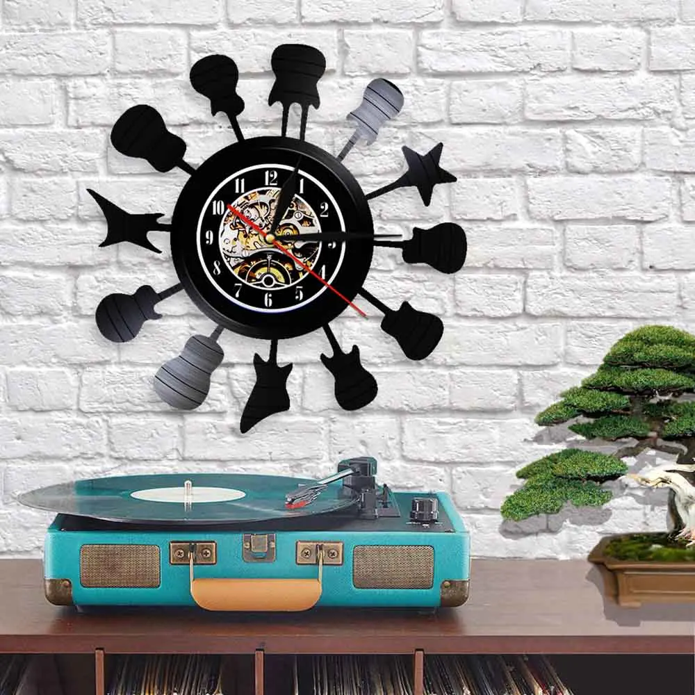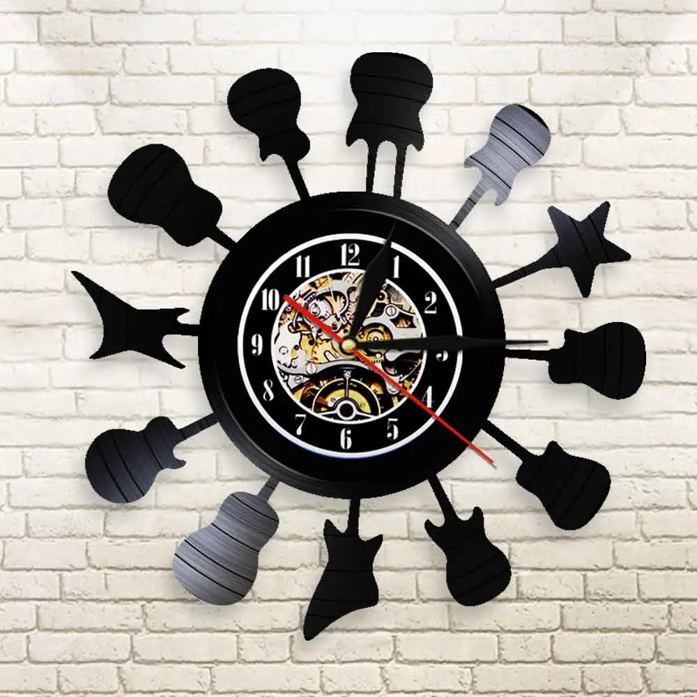Настенные часы с силуэтами круга гитар виниловая пластина настенные часы Рок Музыка электрический гитарист домашний Декор Ретро музыкальный альбом настенные часы