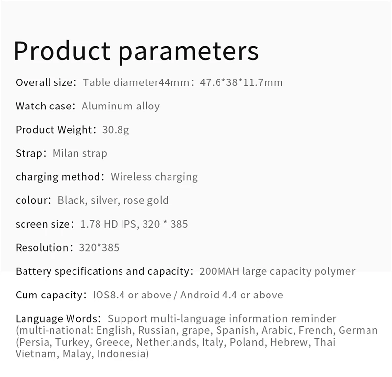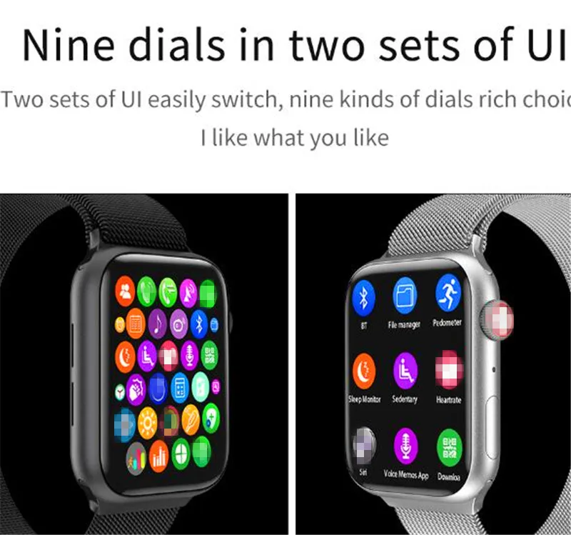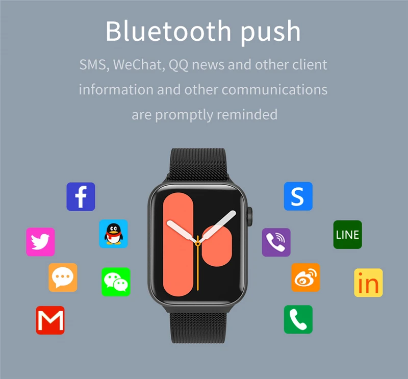 Эти часы поддерживают вызовы по Bluetooth, музыку по bluetooth, поворотную кнопку, частоту сердечных сокращений, температуру тела, шагомер, размер фруктов 6-го поколения, сменный ремешок диаметром 44 мм, меню в умном сотовом стиле, меню Jiugongge, водонепроницаемость
