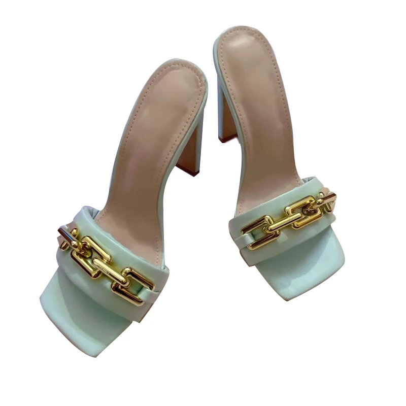 Женская обувь; Летние туфли на высоком тонком каблуке; Шлепанцы на плоской подошве Дамская обувь квадратный носок удобная женская металлическая цепочка "обувь" Pu Женская обувь, Большие размеры 2021 Новые однотонные