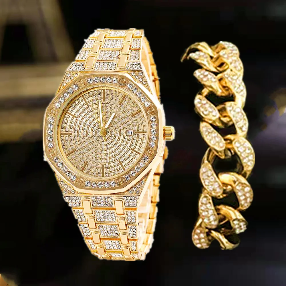 Часы мужские, 3 шт., браслет, ожерелье, хип-хоп, Майами, кубинская цепочка, золотые часы, украшенные камнями, стразы