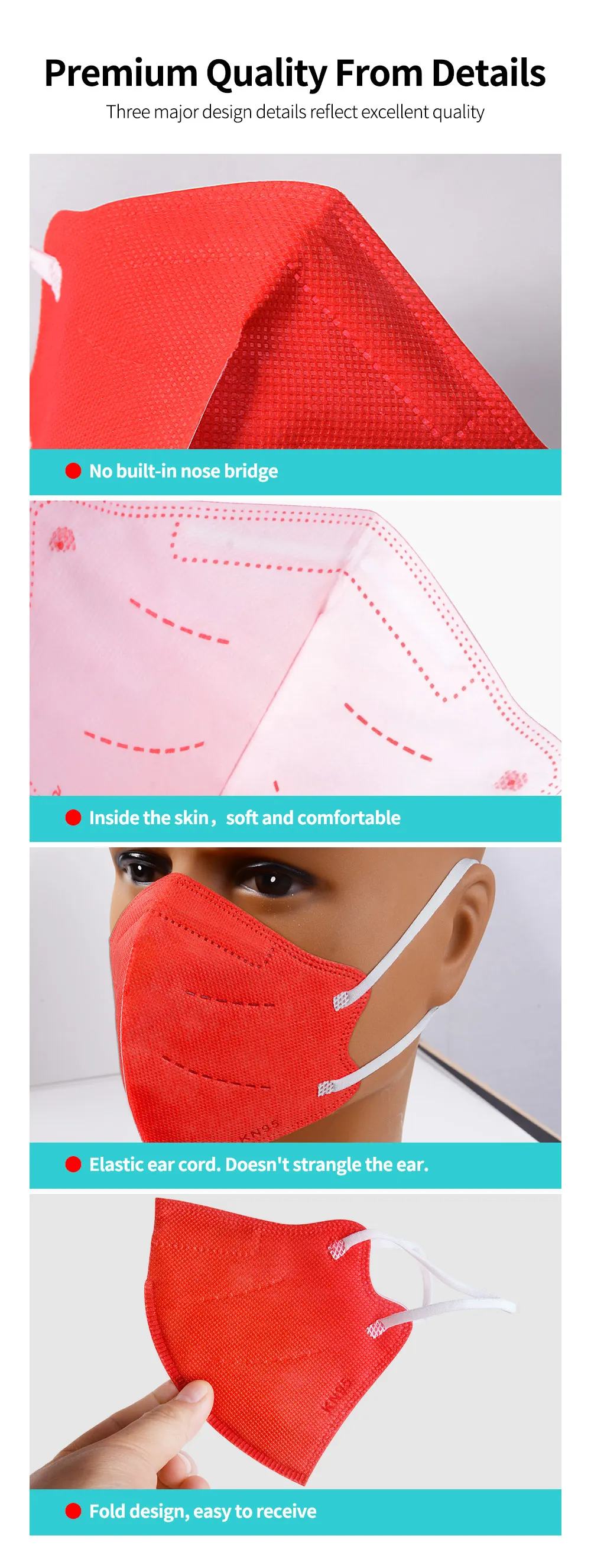 Подробная информация о масках:* Цвет:Белый/розовый/черный/розовый/фиолетовый/оранжевый/красный светильник* Тип: Ношение ушей* Материал: Нетканая ткань + фильтрующий слой* Стандарт: GB2626-2006* Класс защиты: маска kn95 ffp2* Скорость фильтрации: ≥ 95% (0,075мкм частиц)