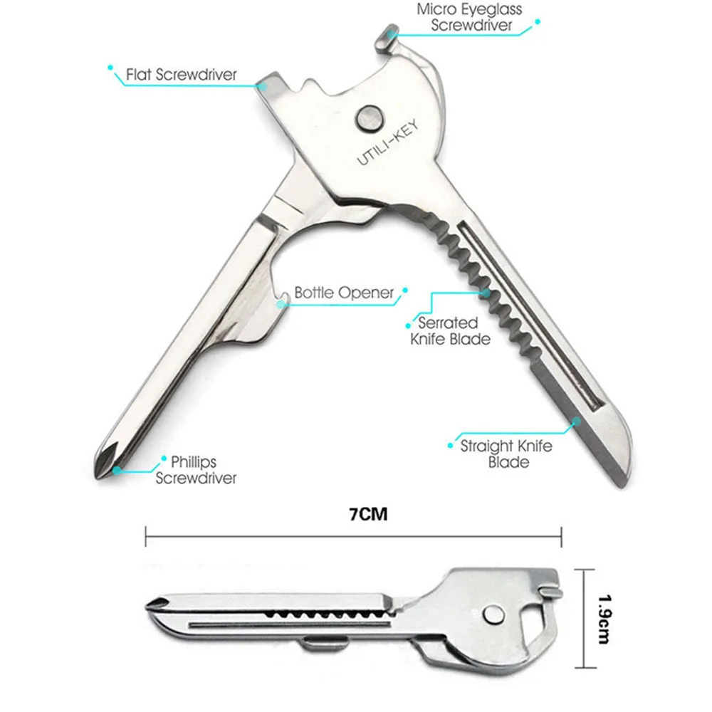 Материал: нержавеющая сталь Размер: 70*19 мм Толщина: 3 мм Посылка в комплекте; 1 * инструмент для ключей Функция: Отвертка Phillips, плоская отвертка, зубчатое лезвие, брелок с простым лезвием, открывалка для бутылок Инструмент 6 в 1 в форме ключа Поместится в ваш брелок/брелок