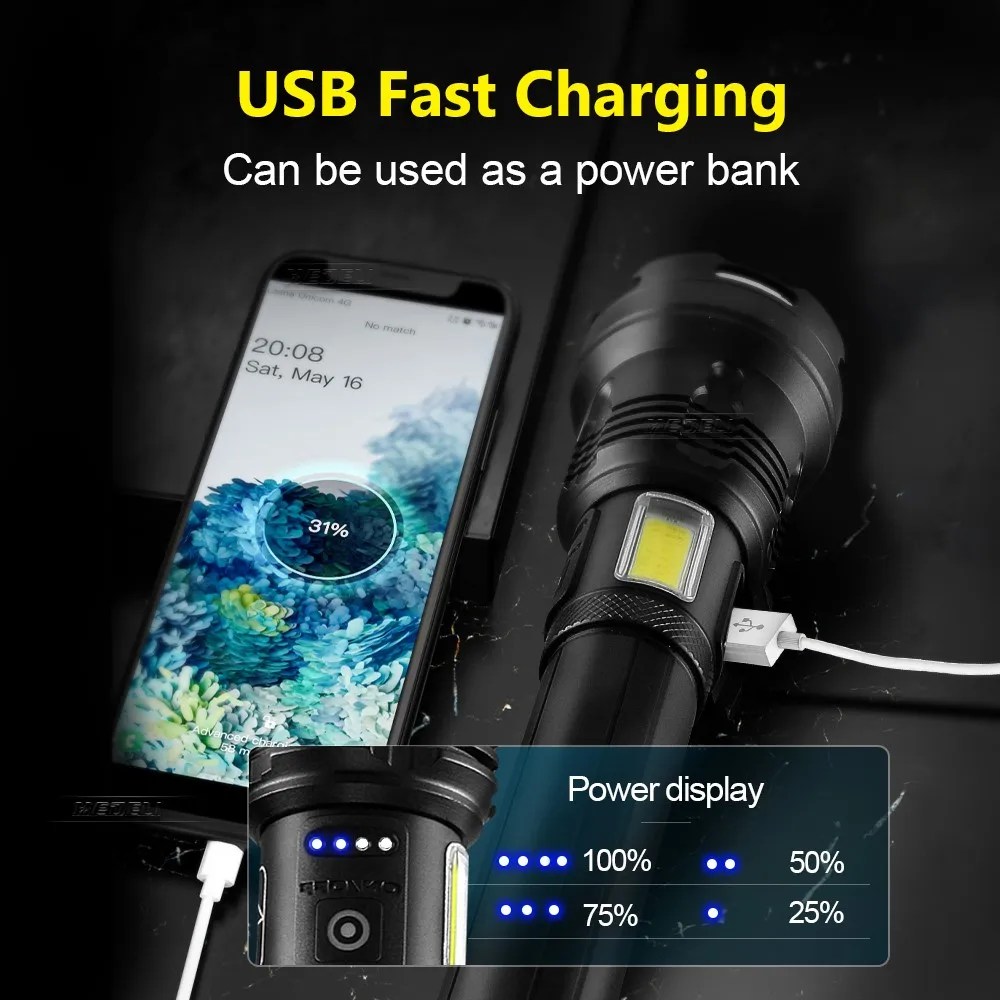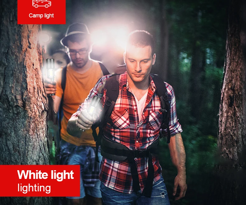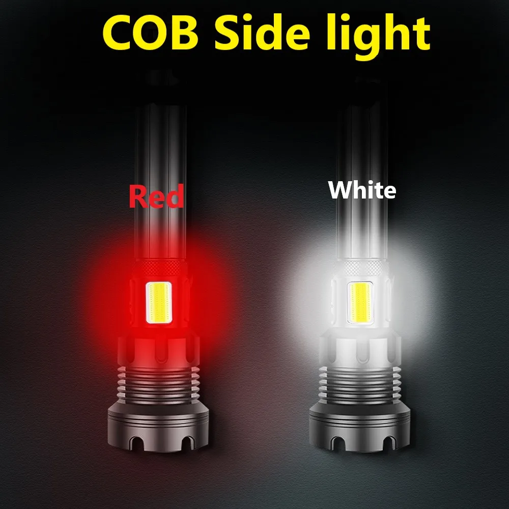 ♥XHP160 + COBФитиль высокой яркости, четырехжильная упаковка фитиля + выпуклая линза, всесторонне улучшает производительность освещения.♥Дизайн лампы COB, красный и белый цвета света, может использоваться как настольная лампа.♥Настоящий материал, супер алюминиевый сплав, сжатие и защита от падения.♥Утопленная конструкция значительно улучшает функцию теплоотвода фонаря.♥Конструкция держателя лампы в форме лотоса может разбить стекло.♥Выдвижной зум, яркий прожектор, мощная мощность на большие расстояния, широкий прожектор, прожектор на большие расстояния, максимальная дальность может достигать 1200 метров.♥Аккумулятор 3600 мАч, с использованием перезаряжаемого аккумулятора 18650 или 26650. Во внутренней проводке используется Высокоэффективная схема наддува для максимального использования аккумулятора. Он имеет более долгий срок службы и долговечность, чем три обычных аккумулятора.♥USB вход и выход, заряженный дисплей, может использоваться как фонарик и аварийный источник питания, двойного назначения.♥Уровень водонепроницаемости может достигать уровня 8, что позволяет легко справиться с суровой внешней средой в ночное время.