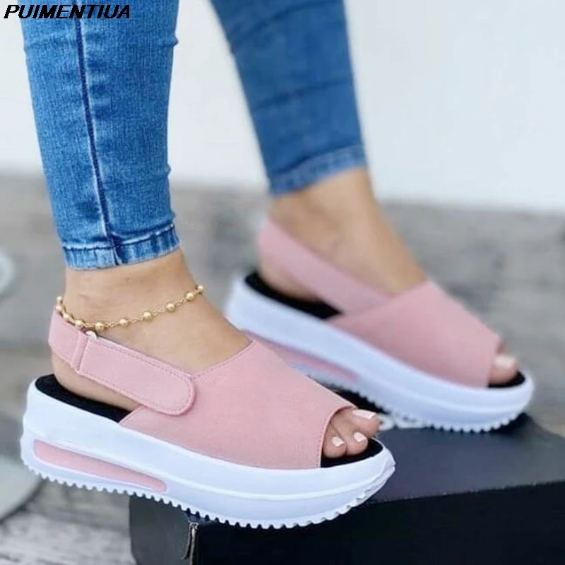 Женские босоножки на танкетке PUIMENTIUA, винтажные босоножки из флока на толстой подошве, лето 2021