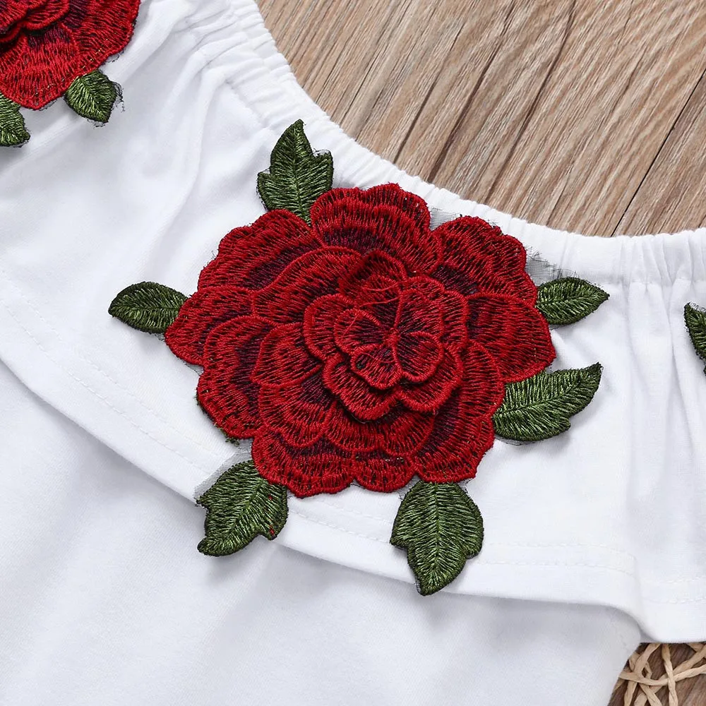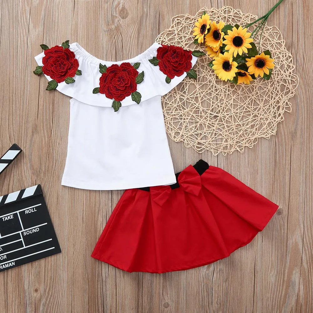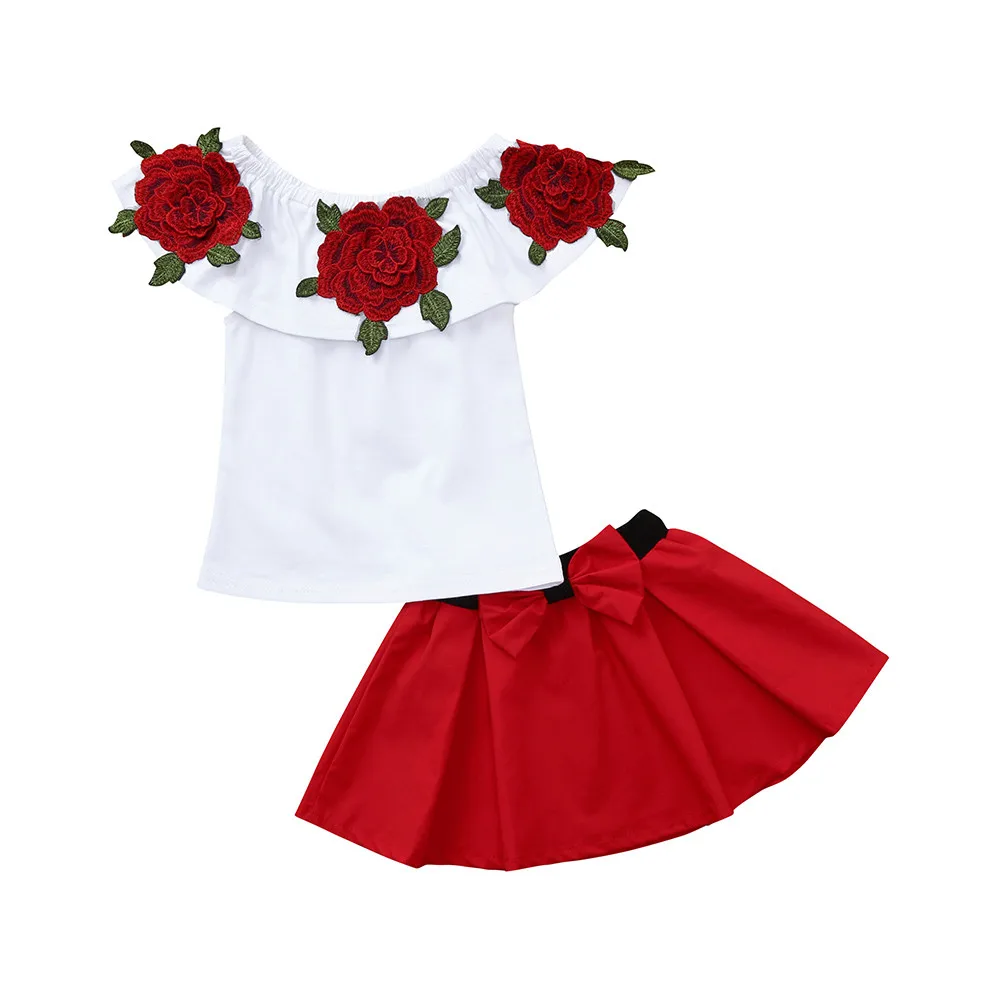 Для маленьких девочек без рукавов Топы с открытыми плечами и вышивкой розы + юбки