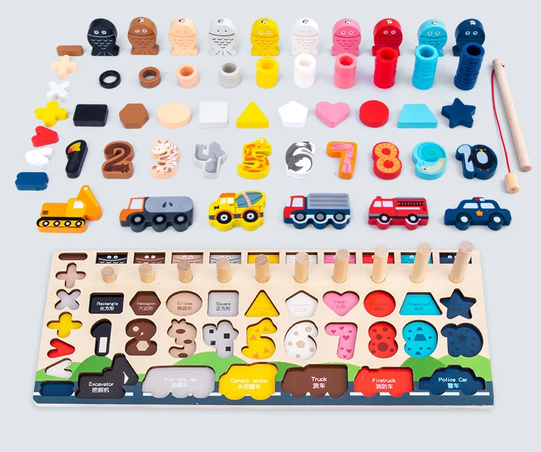 Монтессори Развивающие деревянные игрушки семь в одном номерной знак пазл Рыбалка для дошкольников Детские Математические Игрушки для раннего развития