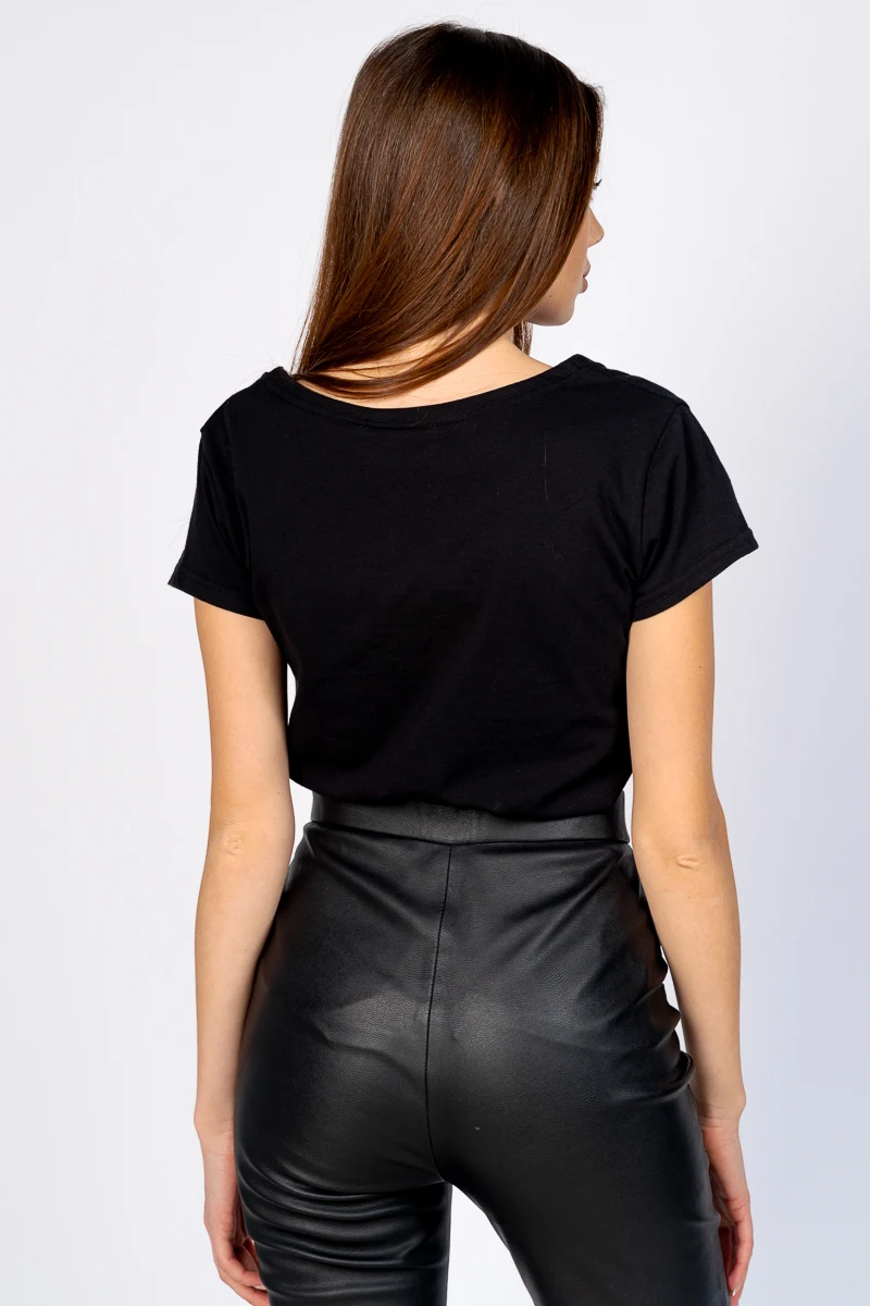 Согласны ли вы с мнением, что черный цвет – это нестареющая классика? Наверняка, у каждой девушки в гардеробе есть темные штаны, платье, блузка и шорты. Если же вы не относите себя к числу таких женщин, то самое время купить женскую футболку черного цвета с оригинальной набивкой в интернет-магазине Твой Фасон.Модель изготовлена из 100% хлопка, а поэтому приятно прилегает к телу, находясь в ней кожа «дышит», а это необходимое условие при носке в жаркое время года. Футболка идеально сочетается с темными и синими джинсами. Большая горловина сексуально преподнесет зону декольте, украсить ее можно небольшой подвеской. А оригинальная набивка позволит вам оставаться в тренде, и немного пофлиртовать.